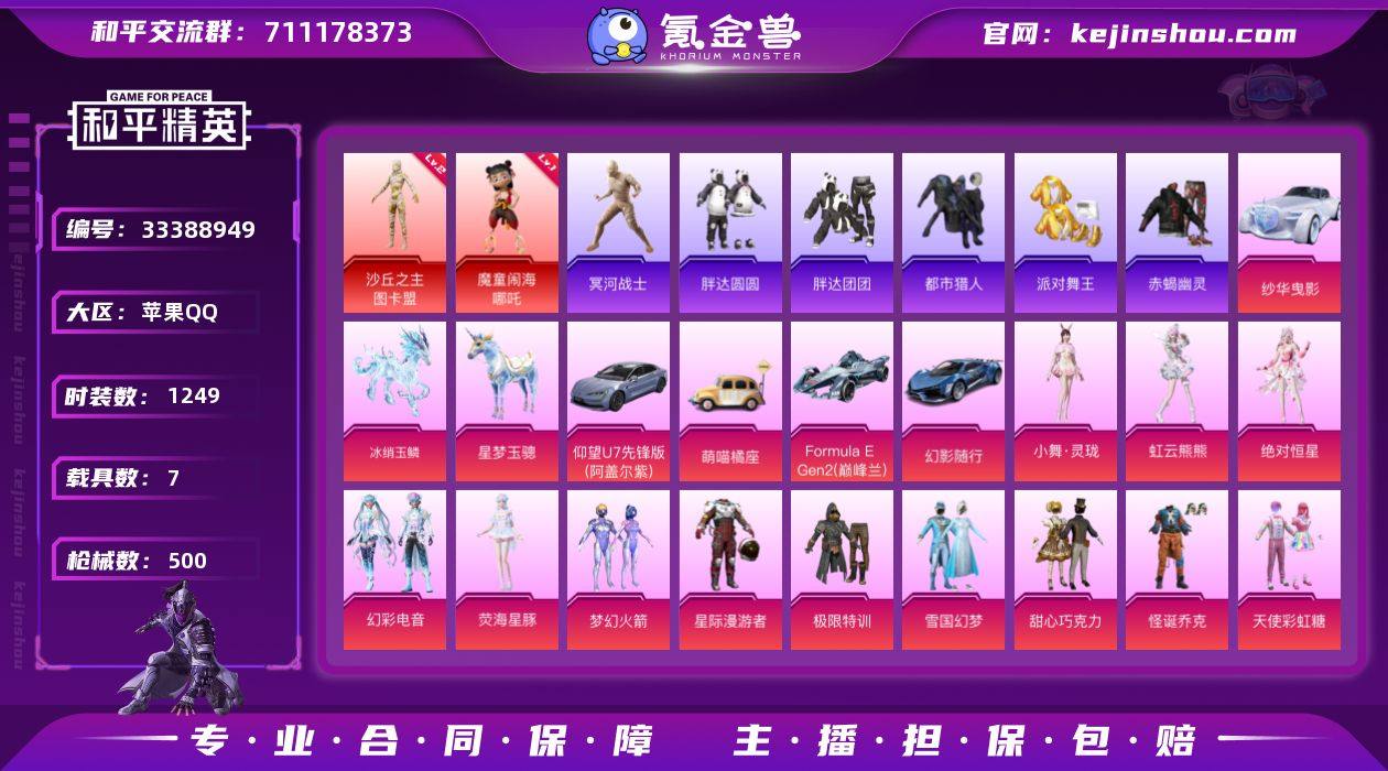 实名: 不可修改 时装数: 1249 载具数: 7 枪械数: 500 战备数: 341 神级装扮: 沙丘之主-图卡盟,魔童闹海-哪吒 热门装扮: 梦幻火箭(新101),星际漫游者,极限特训,幻影战神,甜心巧克力,怪诞乔克,宝贝奶油派,浪漫波比,天使彩虹糖,放客神游,鹰眼刺客,爱崽白熊,好奇恐龙,都市猎人,彗云及圣,绚金战神,新星烈龙,雪国幻梦,星空之魅,冥河战士,精灵娃娃,潮萌小黄鸭,胖达团团,胖达圆圆,奇迹天团,兔兔白日梦,赤蝎幽灵,派对舞王,仲夏莫吉托,第五大道,炫光之旅,蜜语绒猫,烟云彩露,创世·救赎,金丰海韵,幻彩电音,荧海星豚,绝对恒星,虹云熊熊,小舞·灵珑 载具: 萌喵橘座,Formula E Gen2(巅峰兰),幻影随行,仰望U7先锋版(阿盖尔紫),星梦玉骢,冰绡玉鳞,纱华曳影 稀有枪皮: MG3洛神天依,Mini14龙虾霸霸,M762甜蜜誓约,Kar98K伏魔团,M416心之恋语,S12K海渊国主,GROZA焦糖拿铁,AKM盖世英雄,SCAR-L纯梦嫁纱,M417第五大道,P90粉樱探戈,AMR炫光之旅,P90沙丘之主,SPAS-12蜜语绒猫,M416电玩时刻,Mk14精灵梦叶罗丽,UMP45量子极限,AUG星梦奇缘,破片手榴弹秋玉花灯,M762-青锋波束,GROZA-精灵之光,GROZA-镜光银凌,Kar98K-巳巳如意,M200-伏羲圣卦,AUG-暖羊咩咩,Famas-翎光蝶翼,Kar98K-圣域龙灵,AUG-圣斗士星矢,AKS-7...