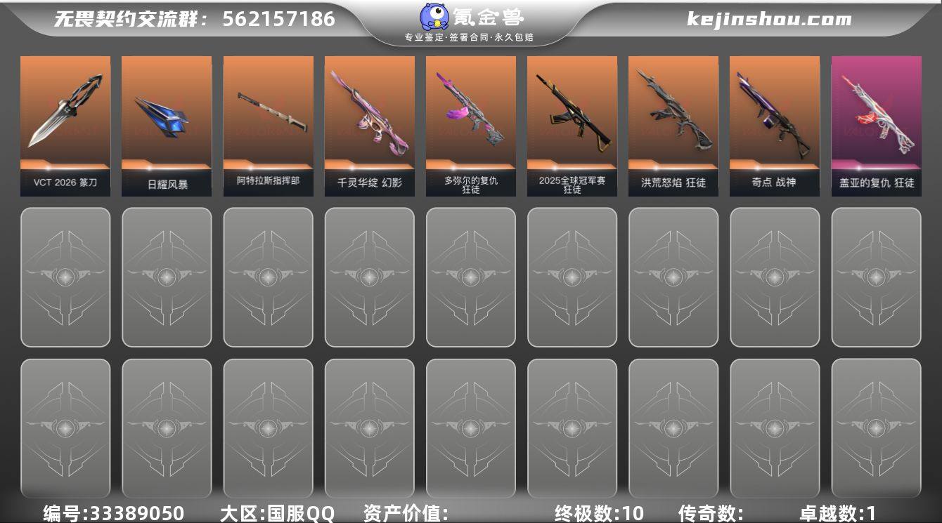 【956891】【wwxb597】【套装】:VCT 2026 赛季套装 【英雄】:幻棱,炼狱,维斯,暮蝶,钛狐,壹决,铁臂,捷风,雷兹,幽影,不死鸟,贤者,猎枭,蝰蛇,零,芮娜,奇乐,尚勃勒,霓虹,斯凯,夜露,星礈,K/O,海神,盖可,黑梦,钢锁 【近战武器】:近战武器-VCT 2026 篆刀,近战武器-镭切,近战武器-盖亚之愠,近战武器-日耀风暴 遗器,近战武器-阿特拉斯指挥部 甩棍 【狂徒】:狂徒-2025全球冠军赛,狂徒-洪荒怒焰,狂徒-多弥尔的复仇,狂徒-盖亚的复仇 【幻影】:幻影-千灵华绽 【战神】:战神-奇点 【骇灵】:骇灵-无限竞技 【鬼魅】:鬼魅-宿怨 【卡面】:树懒大作战 卡面,无畏契约GO!第一卷:芮娜 卡面,无畏契约GO!第一卷:零 卡面,《双城之战》金克丝 卡面,代号红色 卡面,新兵报到 卡面,V契约 卡面,无畏契约 卡面 【喷漆】:审判之爪 喷漆,买装还是存钱 喷漆,关门放狗 喷漆,酷熊冲浪 喷漆,松叶 喷漆,无畏契约GO!第一卷:奇乐 喷漆,胜利属于无畏契约 喷漆,GLHF 喷漆,无畏契约 喷漆 【挂饰】:Z世代特饮 挂饰,天外飞客 挂饰,红鳞松叶 挂饰,《双城之战》魄罗 挂饰,无畏契约 纪念币 挂饰