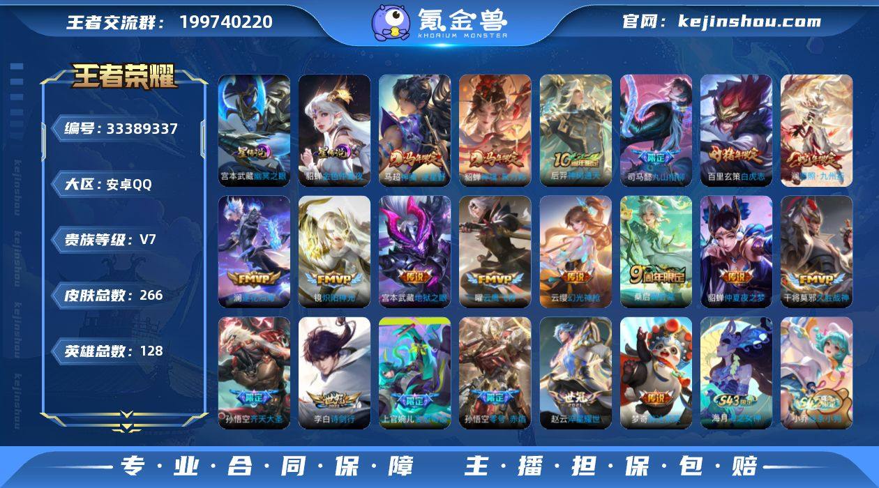 安卓QQ V7六年老号,诚心急出,手慢无! 王者六年老玩家账号,V7贵族等级,53级资深收藏家,收藏等级拉满,排面十足!账号硬价值拉满,总皮肤266款,含20款传说品质皮肤,69款史诗皮,87款绝版限定皮,其中包含蛇年限定、马年限定、FMVP、星传说等多款高人气稀缺皮肤,像澜、孙悟空、貂蝉等热门英雄的高质量皮肤全覆盖,收藏感直接拉满! 全英雄已解锁,全能选手标识加持,对战场次6810,信誉等级7级满分,账号无违规、无封号记录,运行流畅干净,可放心购买。打野21段、中路16段,英雄战力扎实,多个英雄拥有高熟练度,玩梗体验拉满。 已完成实名更换,本年度可配合人脸核验,支持平台包赔服务,换绑流程顺畅,账号交易安全有保障。六年老号,保值性强,不是快餐号,是收藏玩家的优质选择。 诚心出号,不磨叽,价格可小刀,看中直接拍,手慢拍大腿!