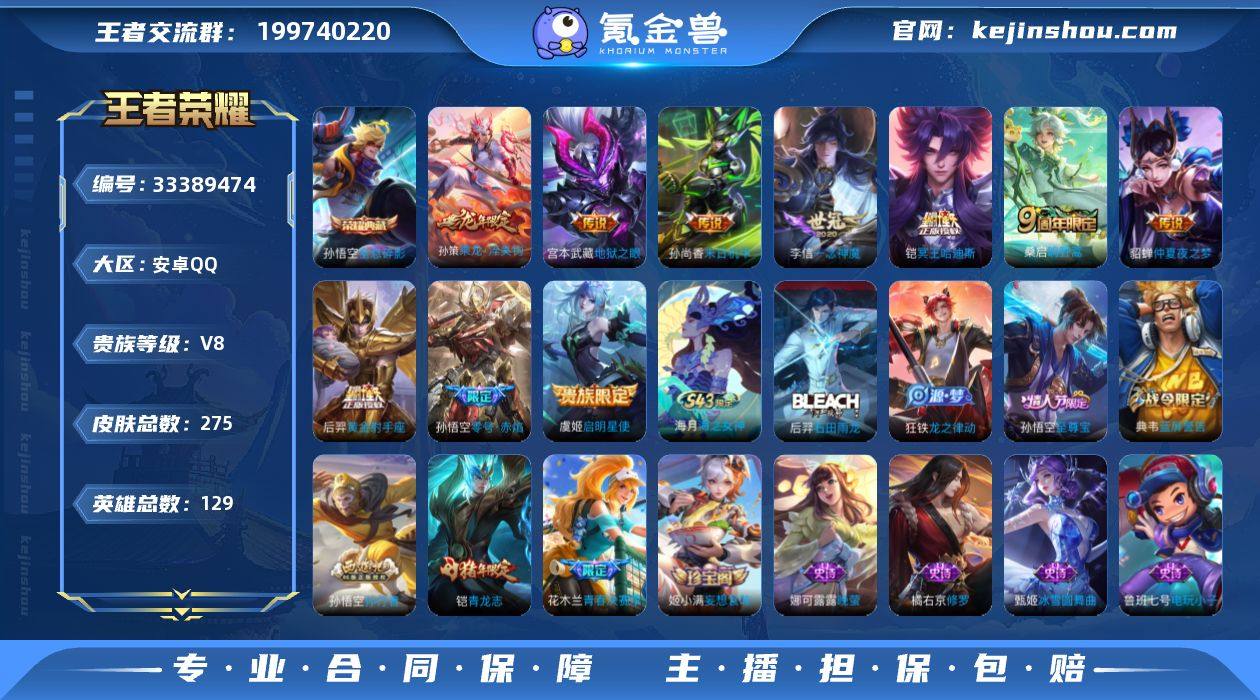 安卓Q-V8-129英雄-275皮肤-1典藏皮肤-10传说-68史诗 【英雄全皮】:孙权全皮 【荣耀典藏】:孙悟空全息碎影 【传说皮肤】:桑启鸣野蒿,铠冥王哈迪斯,孙策乘龙淬吴钩,虞姬启明星使,孙悟空零号赤焰,李信一念神魔,后羿黄金射手座,貂蝉仲夏夜之梦,孙尚香末日机甲,宫本武藏地狱之眼 【限定皮肤】:铠冥王哈迪斯,蒙犽顽岩魄,蔡文姬夏日便利店,大乔绒语心约,虞姬夏日便利店,姜子牙天穹之誓,杨戬破阵退雄兵,狄仁杰阴阳师,赵云皇家上将,嬴政优雅恋人,庄周高山流水,阿轲迷踪丽影,芈月幻夜卜梦,吕布猎兽之王,周瑜赤莲之焰,夏侯惇朔风刀,甄姬女儿国国王,典韦蓝屏警告,狄仁杰魔术师,狄仁杰万华元夜,达摩星际陆战队,达摩沙漠行僧,项羽海滩派对,老夫子醍醐杖,程咬金演武夺筹,刘邦夺宝奇兵,兰陵王金庭之子,花木兰青春决赛季,孙悟空至尊宝,孙悟空零号赤焰,孙悟空孙行者,后羿如梦令,后羿圣弓游侠,李元芳云中旅人,虞姬启明星使,钟馗驱傩正仪,杨玉环遇见飞天,干将莫邪真爱魔法,蔡文姬繁星吟游,鬼谷子原初探秘者,鬼谷子五谷丰年,黄忠火炮绅士,铠青龙志,苏烈千军破阵,百里玄策原初追逐者,弈星混沌棋,沈梦溪星空之诺,沈梦溪大漠名商,明世隐...