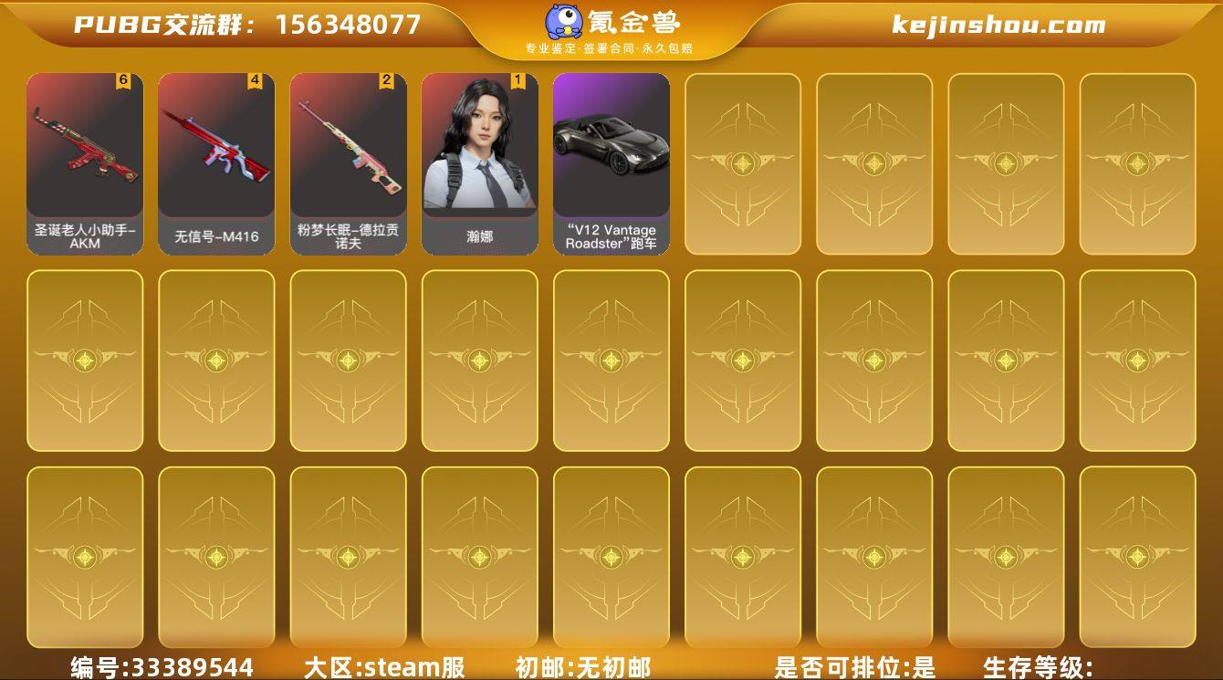 A12638/steam/可排位/5段384级/1张蓝图/6级圣诞老人小助手 - AKM/4级无信号 - M416/2级粉梦长眠 - 德拉贡诺夫/1级瀚娜/阿斯顿马丁SUV/阿斯顿马丁跑车/黑鬼/渔夫帽/北极熊套装/双马尾/丸子头/详情看图 ,4级无信号-M416,2级粉梦长眠-德拉贡诺夫,1级瀚娜,阿斯顿马丁SUV,阿斯顿马丁跑车,6级圣诞老人小助手-AKM