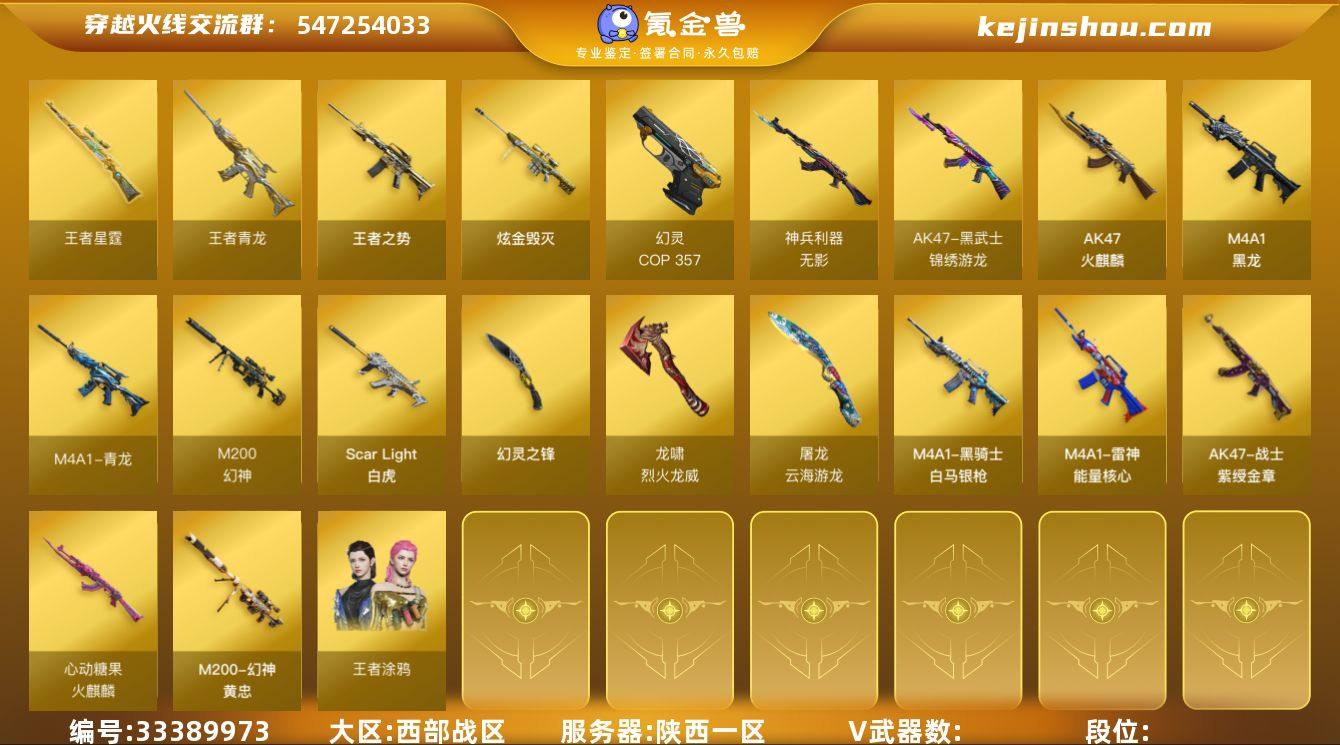 西部陕西一区/可排位/29v/幻神+幻神黄忠/王者星霆/2COP幻灵/Scar白虎+白虎之魄+王者青龙/3幻灵雷/王者之势+炫金毁灭/金刚伞/G36C宇航兔兔/COP独角兽+柯尔特宇航兔兔+柯尔特萌杀+柯尔特玫瑰+柯尔特涂鸦/王者涂鸦+女战神/荣耀之魄+荣耀之锋/详情看图