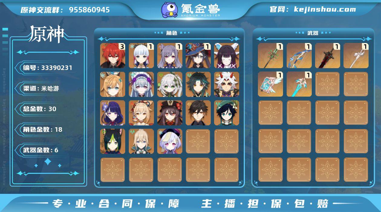 60级/30黄/女主/18个五星角色/6个五星武器 0命纳西妲,0命提纳里,0命荒泷一斗,0命雷电将军,1命神里绫华,0命钟离,0命胡桃,0命魈,0命宵宫,0命温迪,1命刻晴,0命七七,0命琴,1命莫娜,3命迪卢克,0命梦见月瑞希,0命爱可菲,0命哥伦比娅,精1终末嗟叹之诗,精1和璞鸢,精1天空之刃,精1天空之卷,精1风鹰剑,精1狼的末路