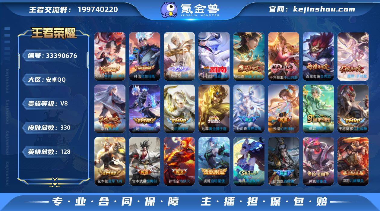 安卓Q-V8-永恒钻石I段位-128英雄-330皮肤-2典藏皮肤-1无双-1珍品传说-16传说-114史诗 【英雄全皮】:刘禅全皮,钟馗全皮,苏烈全皮,敖隐全皮,空空儿全皮,影全皮 【荣耀典藏】:韩信弑枪猎影,安琪拉颠倒童话魔镜 【无双皮肤】:孙悟空无相 【珍品传说】:马可波罗怪盗基德 【传说皮肤】:狄仁杰神骥赴朔漠,干将莫邪千山共赴,虞姬愿照岁时盈,云缨幻光神枪,桑启鸣野蒿,澜逐花归海,宫本武藏惊梅引,孙尚香异界灵契,镜炽阳神光,虞姬启明星使,干将莫邪久胜战神,达摩黄金狮子座,百里玄策白虎志,花木兰冠军飞将,李白凤求凰,孙悟空地狱火 【限定皮肤】:蒙犽顽岩魄,蔡文姬夏日便利店,虞姬夏日便利店,姜子牙天穹之誓,杨戬破阵退雄兵,李白谪仙醉月,狄仁杰阴阳师,赵云皇家上将,墨子神迹守卫,嬴政优雅恋人,孙尚香异界灵契,鲁班七号狮舞东方,庄周高山流水,高渐离死亡摇滚,芈月幻夜卜梦,元歌云间偶戏,马可波罗山海玄木吟,狄仁杰魔术师,狄仁杰万华元夜,达摩沙漠行僧,项羽海滩派对,老夫子航海奇遇记,程咬金演武夺筹,露娜一生所爱,韩信逐梦之影,韩信傲雪梅枪,兰陵王驯魔猎人,兰陵王金庭之子,亚瑟潮玩骑士王,孙悟空至尊宝,孙悟空孙行者,后羿圣...