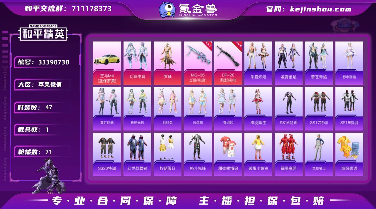 【店主推荐捡漏号!可直接换绑】苹果 微信-2粉装-2特效枪-1载具-2粉色飞行器-22750热力值-4王牌印记-47套装-71枪皮【粉色套装】:粉装-幻彩电音,角色-罗征【粉色枪皮等级】:DP-28-豹影疾电(五级),MG-36-幻彩电音(七级)【粉色载具】:宝马M4(圣保罗黄)【粉色枪皮】:DP-28-豹影疾电,MG-36-幻彩电音【粉色飞行器】:炫彩糖果飞行器,齐天大圣飞行器
