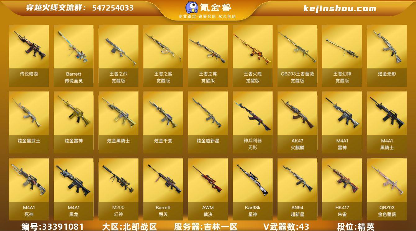 吉林一区-52V-7王者武器数-6炫金武器数 【传说武器】:传说暗裔,传说圣灵 【热门武器】:传说暗裔,传说圣灵,QBZ03-金色蔷薇,Scar Light-白虎,HK417-朱雀,M200-幻神,M200-竞技荣光,Kar98K-星神,M4A1-黑骑士,加特林-炼狱,斯泰尔-蝴蝶,羊驼玩偶*2,裁决-雪莉杨,USP-雷暴,沙鹰-修罗,黄金猫猫手套-白鲨 【王者炫金武器】:炫金骑士,炫金无影,炫金千变,炫金雷神,炫金武士,炫金超新星 【音效卡】:M4A1-雷神音效卡 【皮肤】:雷神-暗月,雷神-星空,火麒麟-雷神,火麒麟-盘古,火麒麟-巅峰荣耀,火麒麟-心动糖果,毁灭耀金皮肤,毁灭-黑大圣皮肤,毁灭-风暴,毁灭-神秘黑洞皮肤,黑骑士-暗月 【角色】:葵,电竞教官-云悠悠,王者-零-国色天香,王者春,王者涂鸦,王者玲珑,王者-迷迭香,修道士,初恋灵狐,嘉年华灵狐,灵狐者-职业经理,潘多拉-X,斯沃特-X,铁骑荣耀,职业选手 【人偶武器】:裁决-雪莉杨,斯泰尔-蝴蝶,AWM-灵狐-15周年嘉年华,COP-旗袍,深渊终结者手雷 【挑战大师】:冰龙粉碎者-白马银枪,激光毁灭者III*2 【英雄级武器】:AK47-火麒麟*2,M4A1-黑龙,M4A1-雷神,M4A1-黑骑士,M4A1-死神,AN94-超新星,HK417-朱雀,Scar Light-白虎,QBZ...