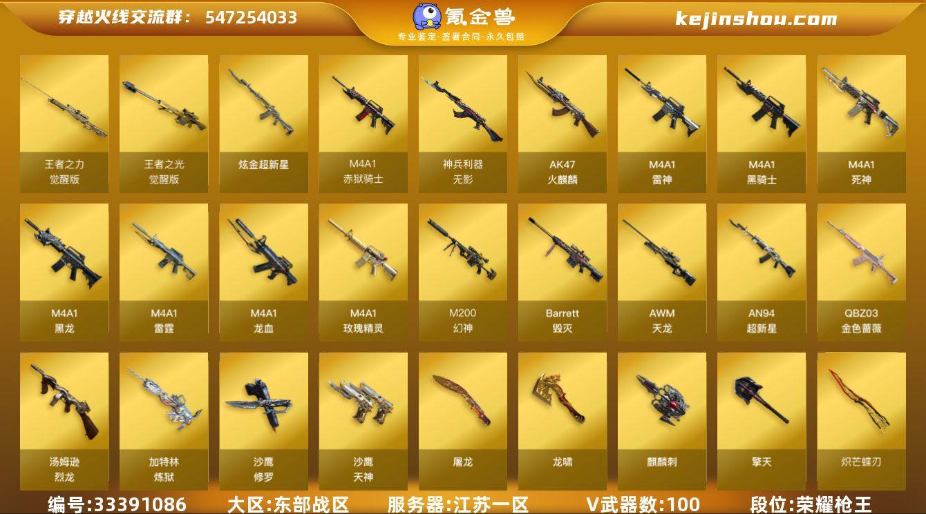 江苏一区-109V-3王者武器数-1炫金武器数 【传说角色】:传说艾莉莎 【热门武器】:QBZ03-金色蔷薇,M200-幻神,炼狱-迷你小钢,M4A1-黑骑士,汤姆逊-烈龙*6,加特林-炼狱*4,沙鹰-修罗*3,炽芒蝶刃,黄金猫猫手套-白鲨 【王者炫金武器】:炫金超新星 【音效卡】:M200-幻神音效卡,AK47-火麒麟音效卡,M4A1-雷神音效卡,Barrett-毁灭音效卡,Barrett-碧霄极光音效卡*3 【皮肤】:M200-幻神-荣耀世冠白鲨,QBZ03-荣耀世冠白鲨,雷神-暗月,雷神-能量核心*2,雷神-星空,雷神-耀金皮肤,雷神-动感闪耀 皮肤,毁灭-暗月,毁灭耀金皮肤,毁灭-星空,毁灭-冠军之怒,黑龙-暗月,黑骑士-暗月*2,无影-暗月,死神-秘银*2,天启-暗月,天龙-能量核心,修罗-能量核心,天神-暗月,屠龙-荣耀世冠AG 【角色】:樱,炫,兰-巾帼英雄,零·纪元,战地猎狐,太空指挥官,乔伊教练,炽天使,初恋灵狐,电竞少女,风暴女,嘉年华灵狐,娟娟,兰-海滩派对,零-水下丽影,灵狐者-黄金海岸,铁骑荣耀,新娜塔莎,影武者-X 【人偶武器】:M4A1-雷神-精英刀锋,炼狱-迷你小钢,AWM-灵狐-15周年嘉年华,迷你牛魔王,迷你牛牛,迷你生化手雷,M4A1-斯沃特 【英雄级武器】:AK47-火麒麟*2,M4A1-黑龙*2...