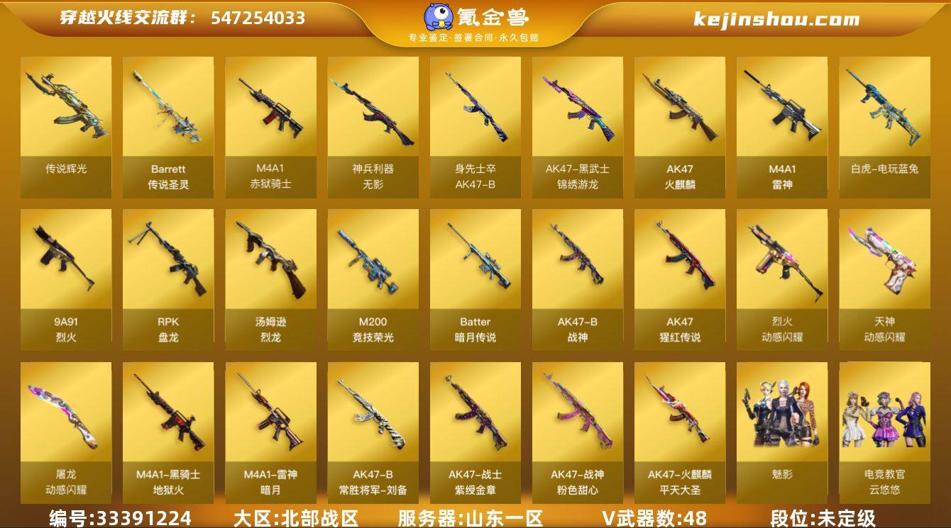 山东一区-58V-3王者武器数-0炫金武器数 【传说武器】:传说辉光,传说圣灵 【热门武器】:传说圣灵,传说辉光,M200-竞技荣光,死亡之眼,白虎-电玩蓝兔,金色小号,炼狱-迷你小钢,牛牛-AK47,汤姆逊-烈龙*6,RPK-盘龙*6 【王者炫金武器】:王者冰锋 【音效卡】:屠龙-电竞之星-竞星跃动音效卡,HK417-朱雀-电竞之星-竞星跃动音效卡,Barrett-碧霄极光音效卡,炼狱-百战金芒-庆典舞曲音效卡,死神-雪域霜狐-怀旧音效卡 【皮肤】:金色蔷薇-电竞之星 皮肤,雷神-暗月,M4A1-再燃火线,雷神-神秘按键 皮肤,火麒麟-平天大圣,黑骑士-地狱火,战神-粉色甜心皮肤,战神-紫绶金章皮肤,AK47-B-常胜将军-刘备,轻型军用手斧-再燃火线 【角色】:魅影,电竞教官-云悠悠,零·纪元,不败狙神,雪域霜狐,奇洋探员,乔伊教练,云海玲珑,葵-阿尔法武装,幻面灵狐,芳心审判者,风暴女,嘉年华灵狐,龙儿-小淘气,潘多拉-甜心教官,斯沃特-X,兔囡囡,雪莉杨-摸金校尉,潘多拉-N 【人偶武器】:炼狱-迷你小钢,AWM-灵狐-15周年嘉年华*2,牛牛-AK47,迷你深渊冰龙,迷你裂空之翼,迷你波特博士,迷你牛牛,迷你生化手雷,生化手雷-机甲核心*2,深渊终结者手雷*2,迷你超能女侍 【暴走生化...