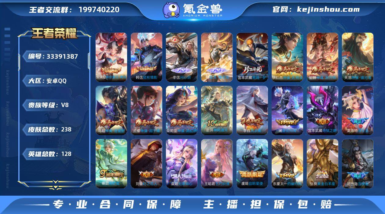 安卓Q-V8-最强王者段位-128英雄-238皮肤-2典藏皮肤-2无双-1珍品传说-18传说-70史诗 【英雄全皮】:夏洛特全皮,空空儿全皮,影全皮 【荣耀典藏】:韩信弑枪猎影,安琪拉颠倒童话魔镜 【无双皮肤】:李信问心剑,曜器灵螭龙剑 【珍品传说】:宫本武藏黑崎一护 【传说皮肤】:云缨神骥越千峰,关羽神骥镇沧海,朵莉亚神骥鸣幻洲,狄仁杰神骥赴朔漠,貂蝉神骥聚万邦,马超神骥逐星野,后羿神树通天,桑启鸣野蒿,澜逐花归海,东皇太一灼幽烈阳,夏洛特浮生妄,虞姬无限倾心,王昭君乞巧织情,虞姬启明星使,刘备时之恋人,张良黄金白羊座,李白凤求凰,宫本武藏地狱之眼 【限定皮肤】:姜子牙天穹之誓,狄仁杰阴阳师,赵云皇家上将,扁鹊奇幻香踪,元歌无心,狄仁杰魔术师,项羽海滩派对,亚瑟潮玩骑士王,孙悟空至尊宝,刘备百相守梦,李元芳云中旅人,虞姬启明星使,虞姬无限倾心,杨戬潮玩骑兵,雅典娜单词大作战,裴擒虎李小龙,裴擒虎擒涛扼浪,瑶山海碧波行,嫦娥拒霜思,嫦娥暖冬兔眠,西施玲珑珍味,蒙犽狂想玩偶喵,鲁班大师探海日志,桑启海盐诗旅,夏洛特浮生妄,暃星界游侠,戈娅驭风魔法,艾琳流音漫舞,司空震地狱燃心,阿古朵江河有灵,张良古海寻踪,蒙犽百解令...