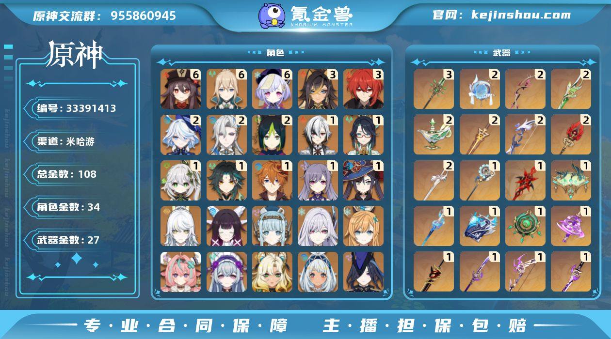 108黄!6+2胡桃!顶级胡行钟夜!冰水战舰!龙芙万希!月感电战舰!蒸仆!超绽放!2+1芙宁娜!2+1龙王!1+1仆人!0+1伊涅芙!1+2草神!1+1闲云!0+2夜兰!1+1达达利亚!0+1绫华!0+1雷神!0+1万叶!满命七七,满命琴,满命胡桃 三命迪卢克,三命迪希雅 二命提纳里,二命那维莱特,二命芙宁娜 一命刻晴,一命达达利亚,一命莫娜,一命魈,一命纳西妲,一命闲云,一命阿蕾奇诺 枫原万叶,优菈,神里绫华,钟离,雷电将军,荒泷一斗,夜兰,流浪者,娜维娅,克洛琳德,玛拉妮,希诺宁,梦见月瑞希,瓦雷莎,爱可菲,丝柯克,伊涅芙,哥伦比娅,兹白 拥有武器: 狼的末路,天空之翼,雾切之回光,飞雷之弦振,天空之卷,和璞鸢,阿莫斯之弓,风鹰剑,天空之刃,天空之脊,护摩之杖,薙草之稻光,苍古自由之誓,赤角石溃杵,神乐之真意,若水,圣显之钥,千夜浮梦,裁叶萃光,碧落之珑,最初的大魔术,万世流涌大典,静水流涌之辉,鹤鸣余音,赤月之形,支离轮光,帷间夜曲 3精武器: 和璞鸢 2精武器: 风鹰剑,护摩之杖,若水,圣显之钥,千夜浮梦,裁叶萃光,最初的大魔术,帷间夜曲 1精武器: 狼的末路,天空之翼,雾切之回光,飞雷之弦振,天空之卷,阿莫斯之弓,天空之刃,天空之脊,薙草之稻光,苍古自由之誓,赤角石溃杵,神乐之真意,碧落之珑,万世流涌大典,...