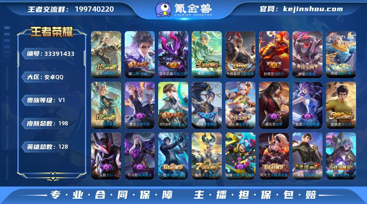 安卓Q-V0-最强王者段位-128英雄-198皮肤-6传说-46史诗 【英雄全皮】:敖隐全皮,影全皮 【传说皮肤】:后羿神树通天,桑启鸣野蒿,曜山海苍雷引,干将莫邪久胜战神,宫本武藏地狱之眼,孙悟空地狱火 【限定皮肤】:姜子牙天穹之誓,杨戬破阵退雄兵,狄仁杰阴阳师,孙尚香蔷薇恋人,元歌无心,马可波罗山海玄木吟,达摩沙漠行僧,项羽海滩派对,韩信傲雪梅枪,兰陵王金庭之子,李元芳云中旅人,雅典娜黎明之约,太乙真人华丽摇滚,鬼谷子五谷丰年,苏烈千军破阵,梦奇顽趣,沈梦溪大漠名商,裴擒虎李小龙,裴擒虎擒涛扼浪,嫦娥暖冬兔眠,曜山海苍雷引,鲁班大师探海日志,桑启海盐诗旅,暃星界游侠,阿古朵江河有灵,张良古海寻踪,蒙恬荣光圣徽,鬼谷子天穹祈灯,姬小满妄想食味,沈梦溪龙舞盛年,刘邦剑破天穹,程咬金群星魔术团,周瑜熔金海岸 【年限皮肤】:曜山海苍雷引,马可波罗山海玄木吟 【赛季限定】:苏烈千军破阵,达摩沙漠行僧,兰陵王金庭之子,沈梦溪大漠名商,李元芳云中旅人,桑启海盐诗旅,裴擒虎擒涛扼浪,鲁班大师探海日志,张良古海寻踪,鬼谷子天穹祈灯,刘邦剑破天穹,姜子牙天穹之誓,东皇太一噬灭天穹,太乙真人谧流熔炉,甄姬逆浪荇歌,雅典娜黎明...
