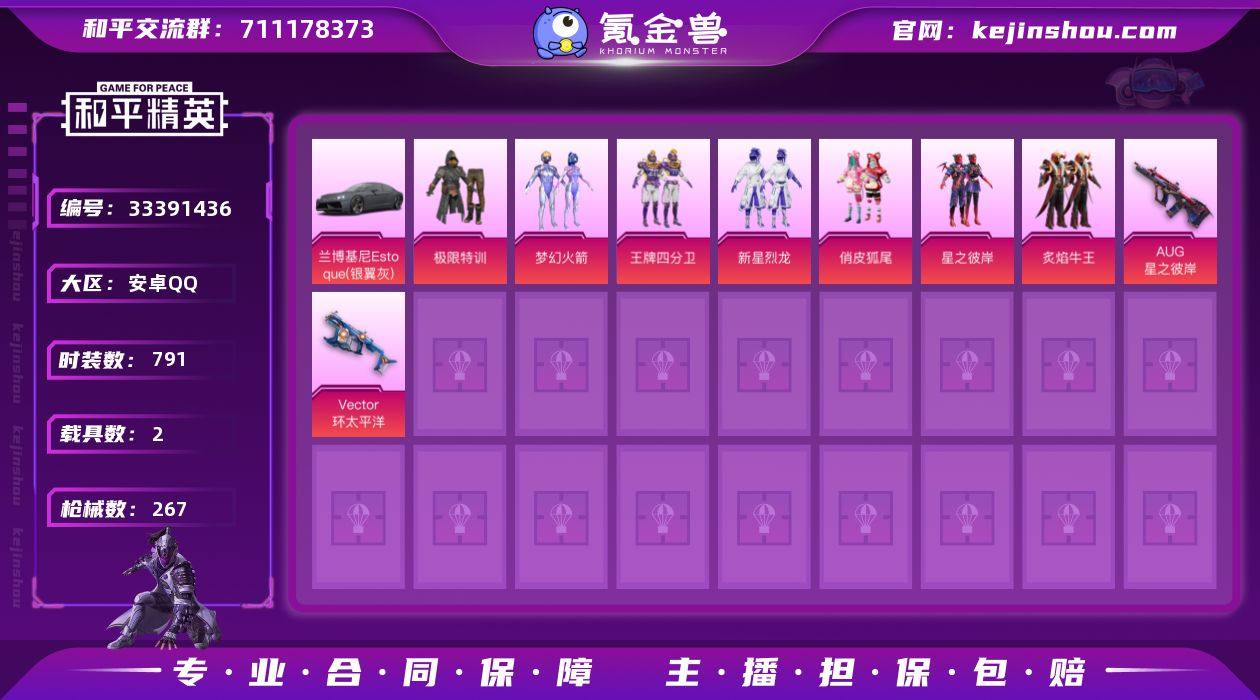 【957039】11粉装 7特效枪 2载具 16印记 可二次 可修改实名 【热门装扮】奇异狩猎者,鸢尾珑雾,冷漠罗丽,荧海星豚,绝对恒星,梦幻火箭(新101) ,极限特训,新星烈龙(小白龙),俏皮狐尾,王牌四分卫,星之彼岸,炙焰牛王,迅捷狂鲨,鹰眼刺客,呆萌铁蟹,深海小丑鱼,都市猎人 【载具】黑曜夜骑,兰博基尼Estoque(银翼灰) 【稀有枪皮】Kar98K-巳巳如意,MK14-福马献瑞,蜜獾-荧海星豚,DP-28-豹影疾电,M249-绝对恒星,AUG星之彼岸,Vector环太平洋 【七级特效枪】七级蜜獾-荧海星豚,七级AUG-星之彼岸,七级Vector-环太平洋 【五级特效枪】五级Kar98K-巳巳如意,五级DP-28-豹影疾电,五级MK14-福马献瑞 【一级特效枪】一级M249-绝对恒星 【紫色装扮】马上有钱,凌霄紫焰,SS34特训套装,朱霞炽焰,擎苍青焰,狂鲨锋刃,游乐,极地朋克,沙漠毒蛇,沙漠兵团,橘黑制服,棕色飞行服,格斗先锋,柠萌假日,极速红龙,战地督导,冷焰舞者,吉莉礼服,夏日音浪,完美偶像,帅气教官,幻世战舞者,幻影武者,怒火燎原,清新柠檬,破晓战魂,猎鹰,猛禽,王牌教练,甜蜜菠萝,白熊同盟,白色伏地魔,破蛋小黄鸡,神秘领域,福星高照,空岛之星,空投萌叽,突袭者,竞技达人朋克,红色运动,海岛探路者,深蓝色名流,湖蓝色名流,滨海假日,滨海厨神,潮流炫...