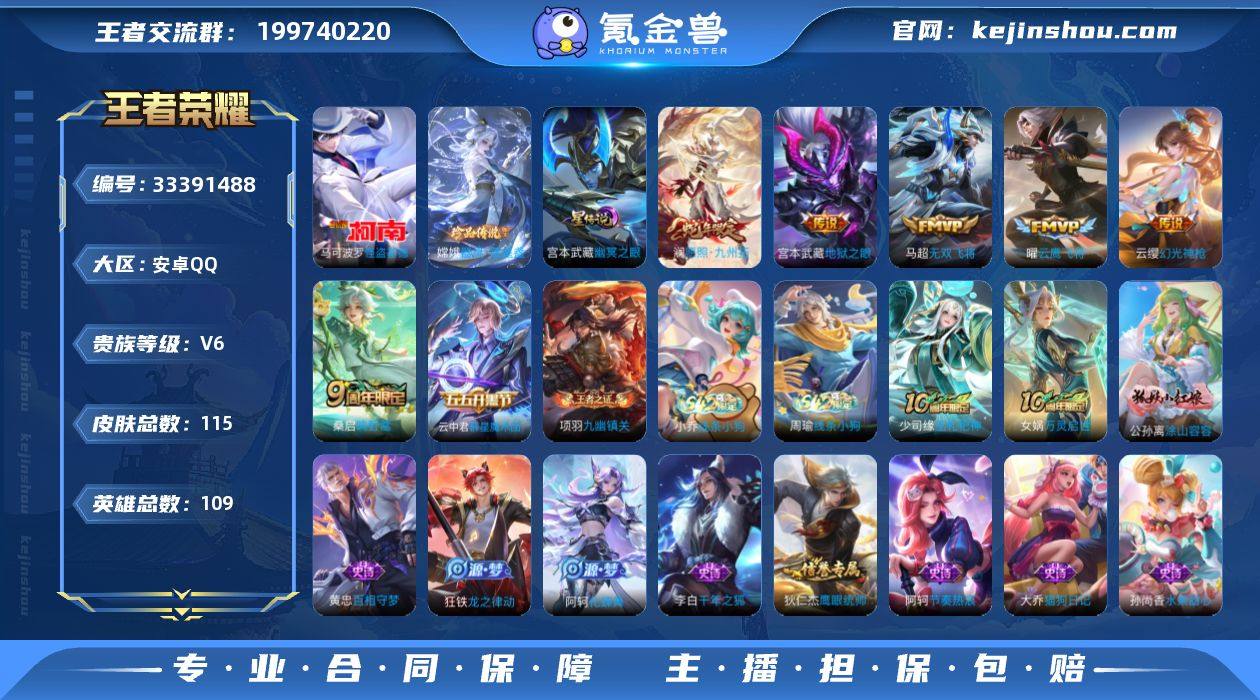 可换绑【精品珍品小号推荐·1金标·双珍品嫦娥怪盗基德·蛇限澜·群星魔术团】 1星传说 7按键 100五级铭文 5王者印记 可二次安卓Q-V6-115皮肤-2珍品传说-7传说-24史诗【英雄全皮】:空空儿全皮【珍品传说】:嫦娥器灵落星盏,马可波罗怪盗基德【星元皮肤】:宫本武藏幽冥之眼【传说皮肤】:澜愿照九州拓,云缨幻光神枪,桑启鸣野蒿,云中君群星魔术团,马超无双飞将,曜云鹰飞将,宫本武藏地狱之眼【限定皮肤】:狄仁杰阴阳师,赵云皇家上将,高渐离玩趣恶龙,狄仁杰魔术师,狄仁杰万华元夜,项羽海滩派对,鬼谷子原初探秘者,沈梦溪大漠名商,刘邦剑破天穹,云中君群星魔术团,刘备异域游侠,周瑜熔金海岸【年限皮肤】:澜愿照九州拓【赛季限定】:鬼谷子原初探秘者,狄仁杰万华元夜,沈梦溪大漠名商,刘邦剑破天穹,东皇太一噬灭天穹,太乙真人谧流熔炉,钟馗虚灵犬护,甄姬逆浪荇歌,亚瑟荣光之誓,牛魔星界战将,项羽九幽镇关【战令限定】:孙膑茶境仙,马超访茗客,周瑜线条小狗,小乔线条小狗 【史诗皮肤】:周瑜线条小狗,小乔线条小狗,项羽九幽镇关,少司缘巫礼祀神,女娲万灵启世,公孙离涂山容容,黄忠百相守梦,狂铁龙之律动,阿轲化蝶舞,孙膑茶境仙,牛魔星界战将,...
