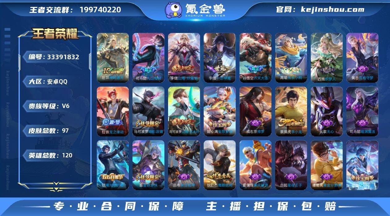 可换绑【精品小号·九山相柳·齐天大圣·炽霜斩·织梦人·玄木吟】7按键,1天幕,7王者印记,五级铭文120,可二次,安卓Q-V6-97皮肤-5传说-33史诗【天幕】:幻夜逐光天幕【传说皮肤】:后羿神树通天,司马懿九山相柳,孙悟空齐天大圣,李信山海炽霜斩,李信一念神魔【限定皮肤】:狄仁杰阴阳师,赵云皇家上将,元歌无心,马可波罗暗影游猎,马可波罗山海玄木吟,狄仁杰魔术师,项羽海滩派对,孙悟空齐天大圣,李元芳云中旅人,苏烈千军破阵,沈梦溪大漠名商,裴擒虎李小龙,裴擒虎擒涛扼浪,李信山海炽霜斩,嫦娥暖冬兔眠,鲁班大师探海日志,桑启海盐诗旅,暃星界游侠,张良古海寻踪,蒙恬荣光圣徽,鬼谷子天穹祈灯,姬小满妄想食味,刘邦剑破天穹,周瑜熔金海岸【年限皮肤】:李信山海炽霜斩,马可波罗山海玄木吟【赛季限定】:苏烈千军破阵,沈梦溪大漠名商,李元芳云中旅人,桑启海盐诗旅,裴擒虎擒涛扼浪,鲁班大师探海日志,张良古海寻踪,鬼谷子天穹祈灯,刘邦剑破天穹,钟馗虚灵犬护,甄姬逆浪荇歌,蒙恬荣光圣徽【战令限定】:马可波罗暗影游猎,暃星界游侠,嫦娥暖冬兔眠,孙膑茶境仙,马超访茗客,周瑜线条小狗【史诗皮肤】:周瑜线条小狗,西施织梦人,黄忠百相守梦,...