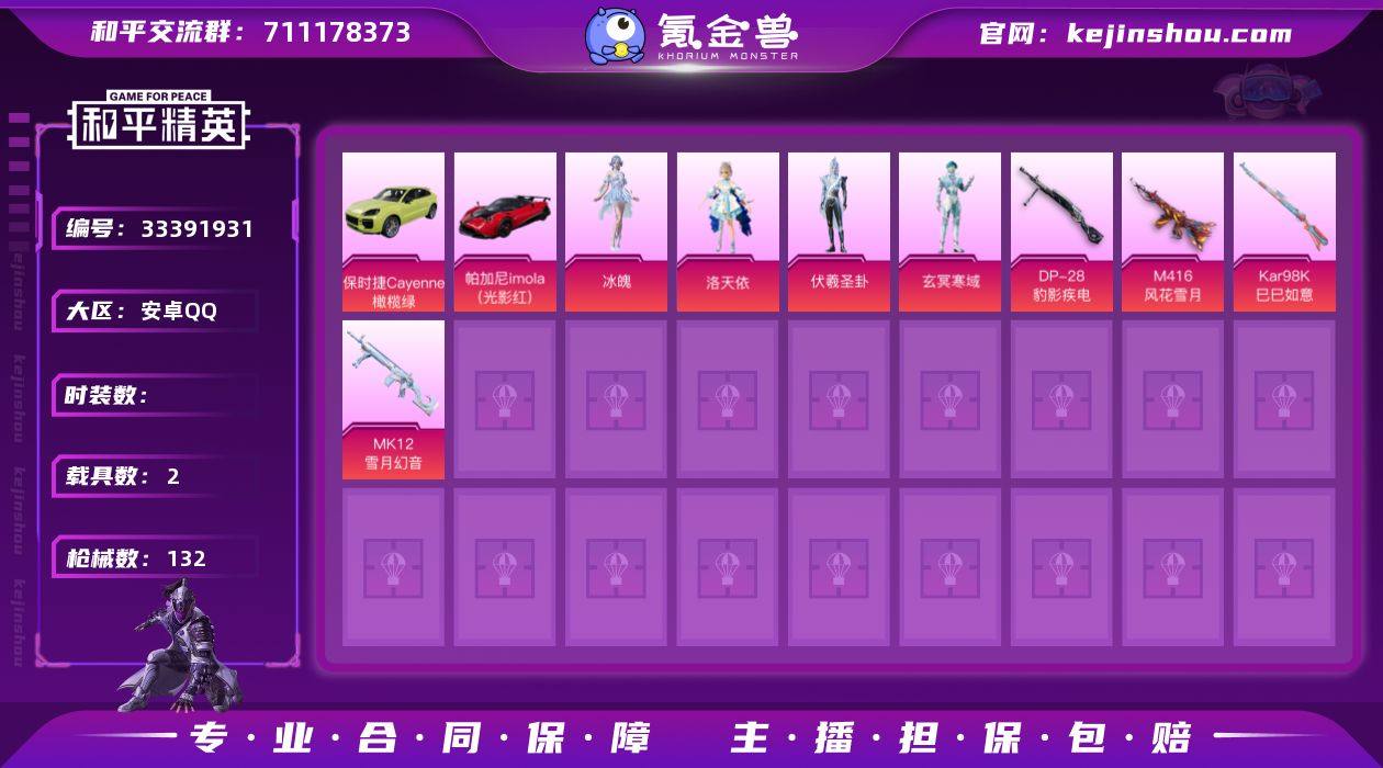 【2载具 4特效枪 4粉装 132枪皮 75套装】3王牌 洛天依 伏羲圣卦,玄冥寒域,冰魄 M416-风花雪月,Kar98K-巳巳如意,MK12-雪月幻音,DP-28-豹影疾电 帕加尼imola(光影红),保时捷Cayenne(橄榄绿),编号:QNWGD58