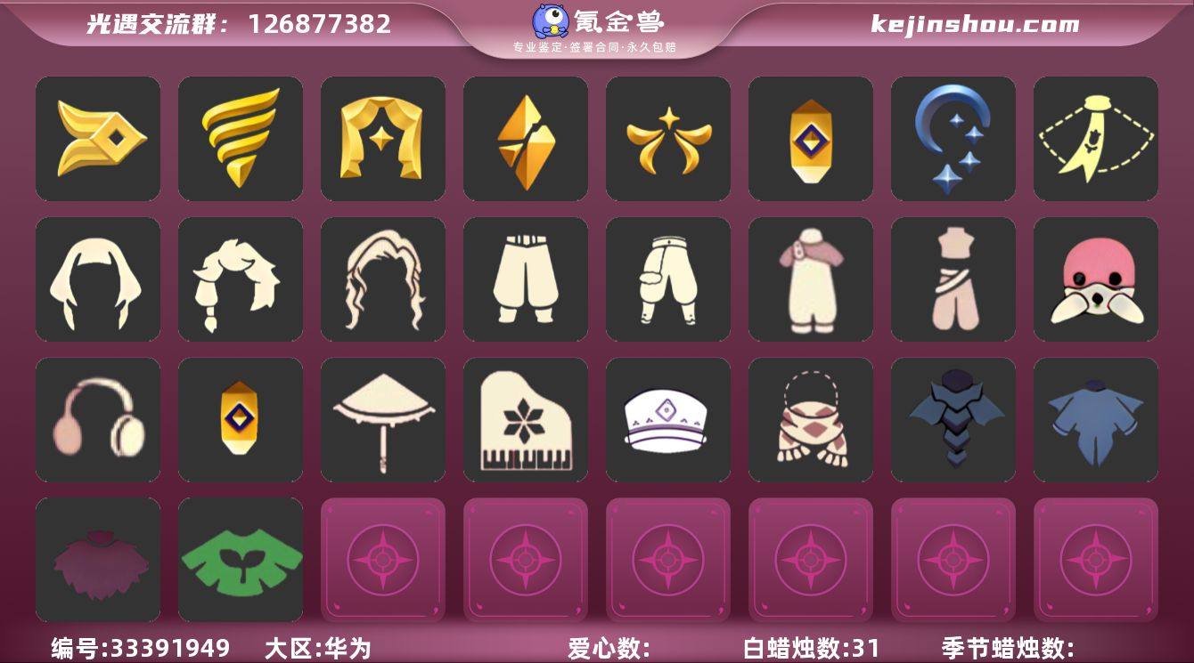 【礼包】绊爱(绊爱斗篷)(绊爱礼包),橘子(大橘大利),兔子(玉兔头饰)(玉兔发饰)(兔子发饰),星月头饰(星月头冠),创始人(创始人斗篷),欧若拉之翼,蝙蝠套(蝙蝠斗篷)(南瓜头),吉他(音韵吉他)(白吉他),人声乐器(欧若拉之声),秋千(情人秋千),南瓜(冥龙南瓜)