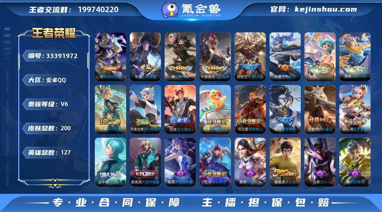 安卓Q-V6-最强王者段位-127英雄-200皮肤-1典藏皮肤-5传说-63史诗 【荣耀典藏】:铠银白咏叹调 【传说皮肤】:百里守约碎云,孙悟空零号赤焰,曜云鹰飞将,李信一念神魔,干将莫邪久胜战神 【限定皮肤】:狄仁杰阴阳师,赵云皇家上将,赵云百木心枪,孙尚香蔷薇恋人,庄周高山流水,钟无艳超时空战士,白起夜都怪侠,芈月幻夜卜梦,元歌无心,甄姬落雪兰心,狄仁杰魔术师,狄仁杰万华元夜,达摩沙漠行僧,项羽海滩派对,老夫子醍醐杖,韩信傲雪梅枪,王昭君午后时光,兰陵王金庭之子,花木兰瑞麟志,孙悟空零号赤焰,李元芳匿光侦查者,李元芳云中旅人,雅典娜单词大作战,鬼谷子原初探秘者,鬼谷子五谷丰年,黄忠火炮绅士,苏烈千军破阵,百里守约朱雀志,沈梦溪大漠名商,明世隐吟游魔法,裴擒虎天狼狩猎者,裴擒虎李小龙,狂铁电玩高手,云中君纤云弄巧,云中君时之祈愿,上官婉儿梁祝,蒙犽狂想玩偶喵,鲁班大师探海日志,镜匿光追影者,桑启海盐诗旅,艾琳流音漫舞,司空震地狱燃心,阿古朵江河有灵,张良古海寻踪,蒙犽百解令,高渐离燃音魔法,妲己灵卜魔法,鬼谷子天穹祈灯,姬小满妄想食味,刘邦剑破天穹,周瑜熔金海岸 【年限皮肤】:花木兰瑞麟志,百里守约朱雀志...