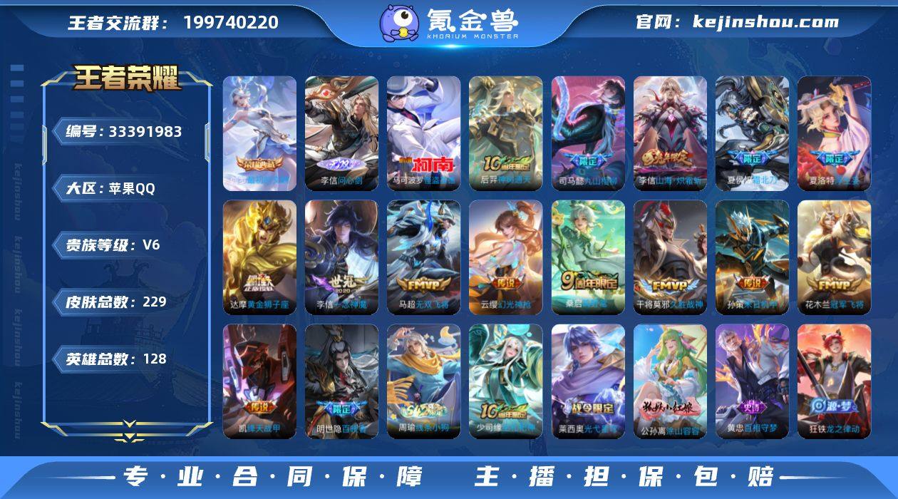 王者20764 无二次 钱包未注销 苹果Q-V6-至尊星耀V段位-128英雄-229皮肤-1典藏皮肤-1无双-1珍品传说-14传说-58史诗 【英雄全皮】:司马懿全皮,李信全皮,敖隐全皮 【荣耀典藏】:伽罗最初的交响 【无双皮肤】:李信问心剑 【珍品传说】:马可波罗怪盗基德 【传说皮肤】:后羿神树通天,司马懿九山相柳,云缨幻光神枪,桑启鸣野蒿,夏侯惇霜北刀,夏洛特浮生妄,李信山海炽霜斩,马超无双飞将,孙策末日机甲,铠绛天战甲,李信一念神魔,干将莫邪久胜战神,达摩黄金狮子座,花木兰冠军飞将 【限定皮肤】:白起狰,夏侯惇霜北刀,虞姬夏日便利店,姜子牙天穹之誓,狄仁杰阴阳师,赵云皇家上将,嬴政优雅恋人,高渐离玩趣恶龙,扁鹊奇幻香踪,狄仁杰魔术师,狄仁杰万华元夜,达摩沙漠行僧,项羽海滩派对,程咬金演武夺筹,兰陵王金庭之子,牛魔御旌,李元芳云中旅人,钟馗驱傩正仪,杨戬潮玩骑兵,雅典娜黎明之约,鬼谷子五谷丰年,铠青龙志,苏烈千军破阵,弈星混沌棋,梦奇顽趣,沈梦溪大漠名商,明世隐疑决卦,裴擒虎擒涛扼浪,狂铁御狮,米莱狄御霄,李信山海炽霜斩,盾山御銮,上官婉儿梁祝,嫦娥拒霜思,嫦娥暖冬兔眠,西施玲珑珍味,鲁班大师探海日志,桑启海盐诗旅,夏...