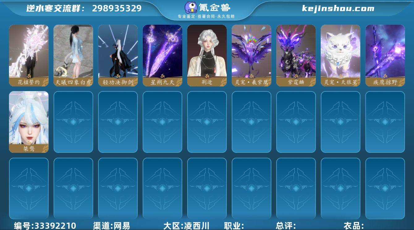 【已用天赏石14】战力值:1895072 总评:1895072 角色等级:89 衣品值: 96135 国色值: 13430 已用天赏石:14 天霓染数量:1 【网易手机账号】 【无换绑冷却】 【鸿音】 【男】 【2级】 【凭栏听雨】 【互通】 天赏外观7 天赏祥瑞1 天赏灵宠2 天赏外观:荆途,桀骜,疾鹰武器,花楹誓约,星辰武器,轻功诀御剑,天曦四象·白虎; 天赏祥瑞:紫霆麟; 天赏灵宠:灵宠·羲紫凰,灵宠·天狼星;