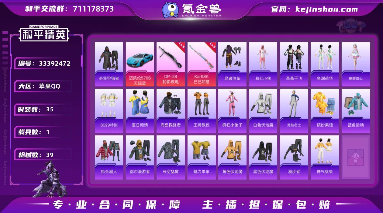 苹果 手Q-0粉装-2特效枪-1载具-0粉色飞行器-12439热力值-1王牌印记-35套装-39枪皮 【热门品类】:套装-奇异狩猎者,套装-忍者信条,套装-粉红小猪 【粉色枪皮等级】:Kar98K-巳巳如意(五级),DP-28-豹影疾电(五级) 【粉色载具】:迈凯伦570S(天际蓝) 【粉色枪皮】:Kar98K-巳巳如意,DP-28-豹影疾电 【粉色降落伞】:纯梦嫁纱降落伞,创世·救赎降落伞,星穹咏叹调降落伞,鸢尾珑雾降落伞 【稀有套装】:套装-迅捷龙虾,套装-遗迹猎人,套装-燕燕于飞,套装-鱼渊荷华,角色-糖霜甜心 【稀有枪皮】:AKM-破晓战魂,SCAR-L-炫彩节奏,M416-红色方程式,GROZA-懵萌河马,M762-天降萌叽,G36C-懵萌河马,UMP45-电音之王,汤姆逊-天降萌叽,P90-巳巳如意,SKS-金玉无双,Mini14-耀粉歌者,DP-28-彩虹符号,MG3-幻世战舞者 【其他套装】:套装-SS29特训,套装-夏日倾情,套装-海岛探路者,套装-王牌教练,套装-疯狂小兔子,套装-白色伏地魔,套装-竞技名士,套装-粉红小猪,套装-缤纷果语,套装-蓝色运动,套装-街头潮人,套装-都市漫游者,套装-长空猛禽,套装-魅力单车,套装-黄色伏地魔,套装-黑色伏地魔,套装-漫步者,套装-奇异狩猎者,套装-神气柴柴 【营地ID】:979125644