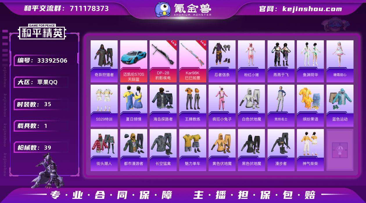苹果 手Q-0粉装-2特效枪-1载具-0粉色飞行器-12439热力值-1王牌印记-35套装-39枪皮 【热门品类】:套装-奇异狩猎者,套装-忍者信条,套装-粉红小猪 【粉色枪皮等级】:Kar98K-巳巳如意(五级),DP-28-豹影疾电(五级) 【粉色载具】:迈凯伦570S(天际蓝) 【粉色枪皮】:Kar98K-巳巳如意,DP-28-豹影疾电 【粉色降落伞】:纯梦嫁纱降落伞,创世·救赎降落伞,星穹咏叹调降落伞,鸢尾珑雾降落伞 【稀有套装】:套装-迅捷龙虾,套装-遗迹猎人,套装-燕燕于飞,套装-鱼渊荷华,角色-糖霜甜心 【稀有枪皮】:AKM-破晓战魂,SCAR-L-炫彩节奏,M416-红色方程式,GROZA-懵萌河马,M762-天降萌叽,G36C-懵萌河马,UMP45-电音之王,汤姆逊-天降萌叽,P90-巳巳如意,SKS-金玉无双,Mini14-耀粉歌者,DP-28-彩虹符号,MG3-幻世战舞者 【其他套装】:套装-SS29特训,套装-夏日倾情,套装-海岛探路者,套装-王牌教练,套装-疯狂小兔子,套装-白色伏地魔,套装-竞技名士,套装-粉红小猪,套装-缤纷果语,套装-蓝色运动,套装-街头潮人,套装-都市漫游者,套装-长空猛禽,套装-魅力单车,套装-黄色伏地魔,套装-黑色伏地魔,套装-漫步者,套装-奇异狩猎者,套装-神气柴柴 【营地ID】:979125644