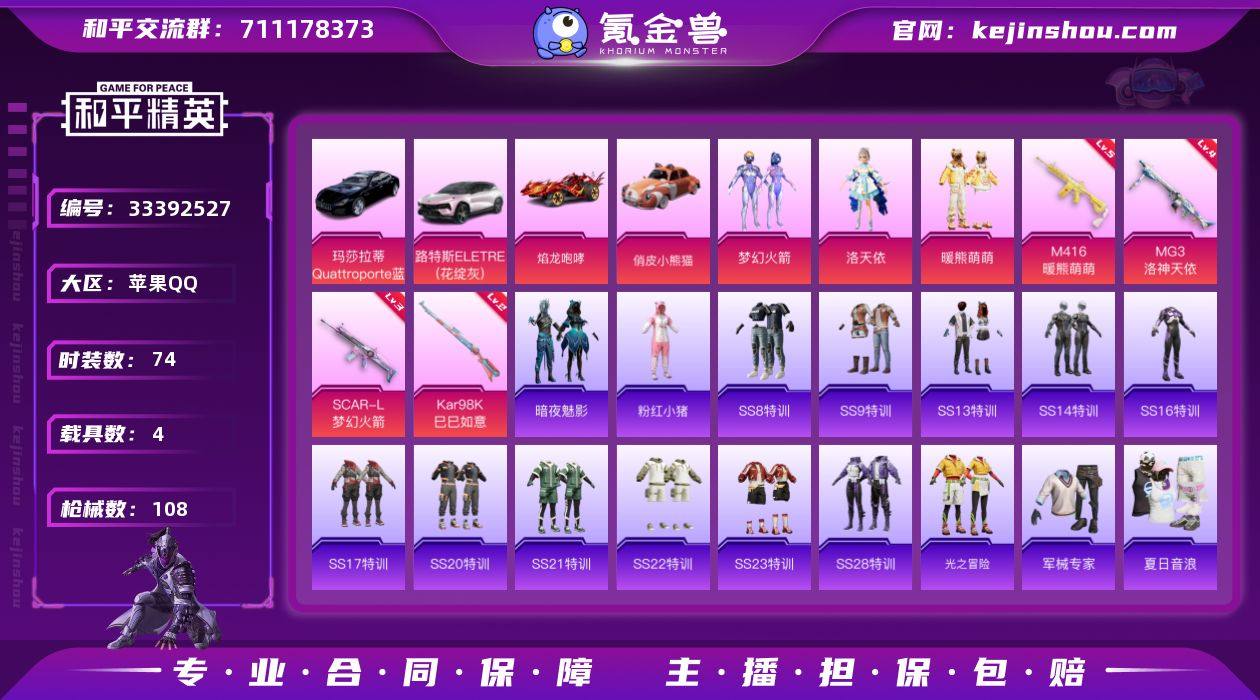 苹果【小号 粉装-梦幻火箭,角色-洛天依,SCAR-L-梦幻火箭(三级),M416-暖熊萌萌(五级),路特斯ELETRE(花绽灰),玛莎拉蒂Quattroporte(夜幕蓝) 】 手Q-3粉装-4特效枪-4载具-1粉色飞行器-38972热力值-5王牌印记-74套装-108枪皮 【热门品类】:粉装-梦幻火箭,套装-粉红小猪 【粉色套装】:粉装-梦幻火箭,角色-洛天依,粉装-暖熊萌萌 【粉色枪皮等级】:SCAR-L-梦幻火箭(三级),M416-暖熊萌萌(五级),Kar98K-巳巳如意(二级),MG3-洛神天依(四级) 【粉色载具】:路特斯ELETRE(花绽灰),玛莎拉蒂Quattroporte(夜幕蓝),焰龙咆哮,俏皮小熊猫 【粉色枪皮】:SCAR-L-梦幻火箭,M416-暖熊萌萌,Kar98K-巳巳如意,MG3-洛神天依 【粉色飞行器】:梦幻火箭飞行器 【粉色降落伞】:梦幻火箭降落伞,洛神天依降落伞,暖熊萌萌降落伞,彩虹甜喵降落伞 【稀有套装】:套装-迅捷龙虾,套装-遗迹猎人 【稀有枪皮】:AKM-冰凉西瓜,AKM-夜灯,AKM-灼热熔岩,AKM-破晓战魂,AKM-虎虎生威,M16A4-夜灯,SCAR-L-炫彩节奏,SCAR-L-玉兔迎春,M416-蓝色火焰,GROZA-治愈之星,GROZA-田园牧歌,AUG-纯梦嫁纱,AUG-耀粉歌者,QBZ-洛神天依,M762-天降萌叽,M762-彩虹甜喵,M762-暖熊萌萌,M76...
