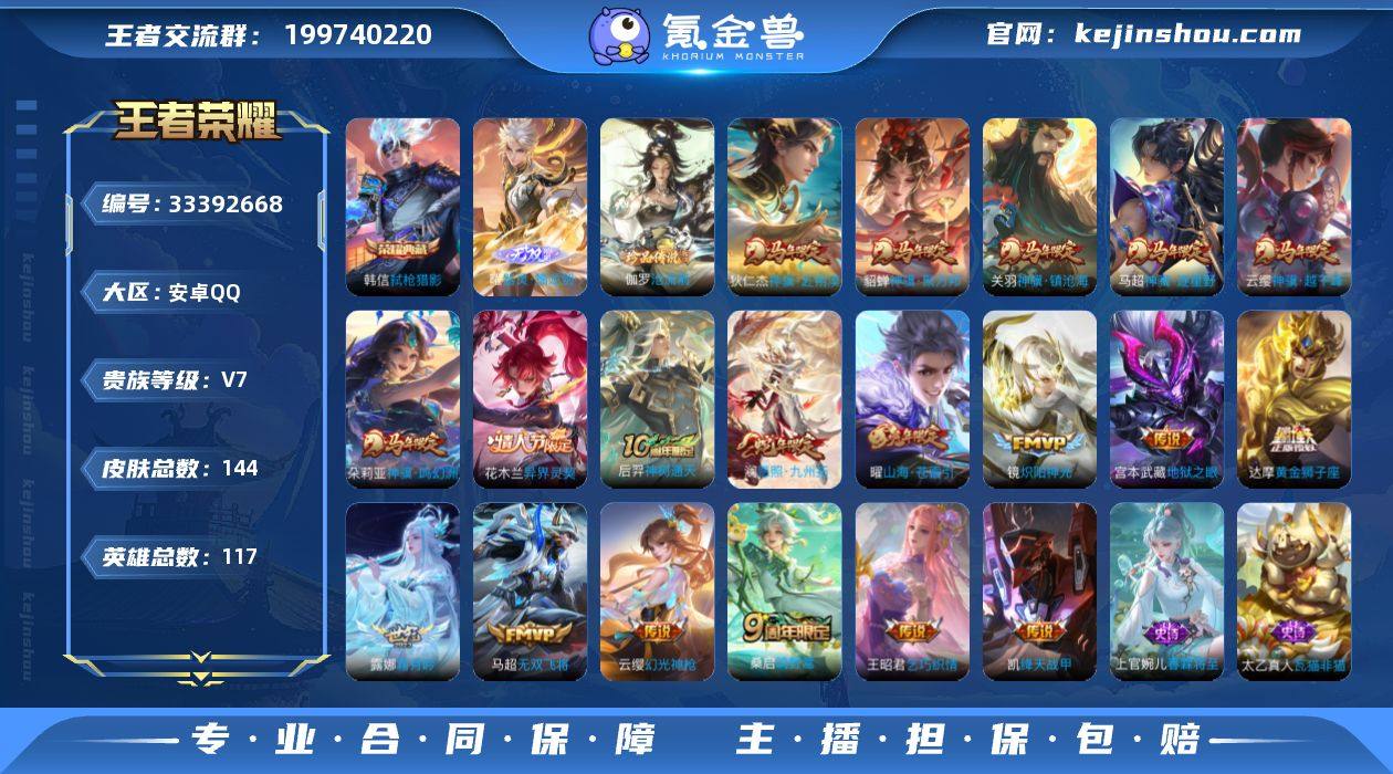 安卓Q-V7-最强王者段位-117英雄-144皮肤-1典藏皮肤-1无双-1珍品传说-19传说-43史诗 【英雄全皮】:孙权全皮,敖隐全皮,空空儿全皮,影全皮 【荣耀典藏】:韩信弑枪猎影 【无双皮肤】:曜器灵螭龙剑 【珍品传说】:伽罗沧流箭 【传说皮肤】:云缨神骥越千峰,关羽神骥镇沧海,朵莉亚神骥鸣幻洲,狄仁杰神骥赴朔漠,貂蝉神骥聚万邦,马超神骥逐星野,花木兰异界灵契,后羿神树通天,澜愿照九州拓,云缨幻光神枪,桑启鸣野蒿,露娜霜月吟,曜山海苍雷引,马超无双飞将,王昭君乞巧织情,铠绛天战甲,镜炽阳神光,达摩黄金狮子座,宫本武藏地狱之眼 【限定皮肤】:暃埋骨钱,李白谪仙醉月,狄仁杰阴阳师,赵云皇家上将,孙尚香蔷薇恋人,元歌无心,狄仁杰魔术师,项羽海滩派对,裴擒虎李小龙,曜山海苍雷引,沈梦溪龙舞盛年 【年限皮肤】:曜山海苍雷引,澜愿照九州拓 【赛季限定】:东皇太一噬灭天穹,太乙真人谧流熔炉,钟馗虚灵犬护,甄姬逆浪荇歌,亚瑟荣光之誓,项羽九幽镇关 【战令限定】:孙膑茶境仙,马超访茗客,刘禅鸭鸭历险记,沈梦溪鸭鸭历险记,莱西奥光弋星穹,明世隐往忆晖光,周瑜线条小狗,小乔线条小狗 【史诗皮肤】:上官婉儿春霖将至,太乙真人瓦猫非猫,周...