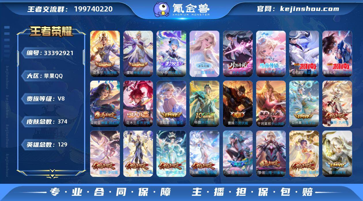 苹果Q-V8-最强王者段位-129英雄-374皮肤-2典藏皮肤-1典藏英雄-2无双-4珍品传说-29传说-107史诗 【英雄全皮】:露娜全皮,孙权全皮,敖隐全皮,蒙恬全皮,司空震全皮,空空儿全皮 【荣耀典藏】:武则天英雄,花木兰九霄神辉,虞姬神鉴启示录 【无双皮肤】:甄姬雪境奇遇,小乔时之魔女 【珍品传说】:暃朽木白哉,瑶大耳狗之梦,鲁班七号江户川柯南,马可波罗怪盗基德 【传说皮肤】:朵莉亚神骥鸣幻洲,花木兰异界灵契,王昭君长夜焕生,杨戬纵目迁山,曹操万灵伏威,干将莫邪千山共赴,公孙离云诺千山,司空震愿照山河定,女娲愿照千秋盛,妲己愿照众生和,澜愿照九州拓,蔡文姬愿照福禄聚,虞姬愿照岁时盈,云缨幻光神枪,桑启鸣野蒿,亚连落雪白狼,露娜霜月吟,大乔时之奇旅,马可波罗妄想实况,公孙离记忆之芯,李信山海炽霜斩,吕布怒海麟威,露娜启示之音,镜炽阳神光,虞姬启明星使,达摩黄金狮子座,后羿黄金射手座,孙尚香末日机甲,武则天海洋之心 【限定皮肤】:白起狰,蒙犽顽岩魄,蔡文姬夏日便利店,虞姬夏日便利店,姜子牙天穹之誓,李白谪仙醉月,狄仁杰阴阳师,虞姬凯尔特女王,赵云皇家上将,嬴政优雅恋人,嬴政白昼王子,鲁班七号狮舞东方,庄周蜃楼王,孙...