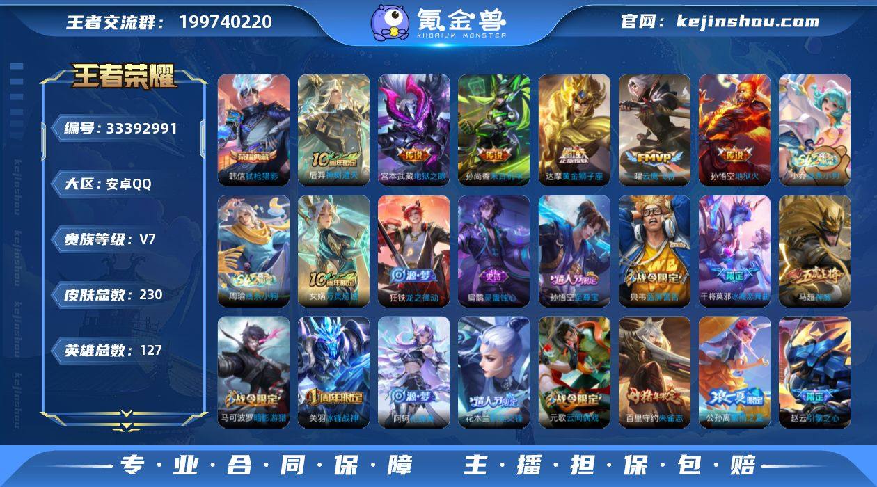 安卓Q-V7-最强王者段位-127英雄-230皮肤-1典藏皮肤-6传说-75史诗 【英雄全皮】:孙权全皮 【荣耀典藏】:韩信弑枪猎影 【传说皮肤】:后羿神树通天,曜云鹰飞将,达摩黄金狮子座,孙尚香末日机甲,宫本武藏地狱之眼,孙悟空地狱火 【限定皮肤】:白起狰,姜子牙天穹之誓,狄仁杰阴阳师,赵云皇家上将,赵云引擎之心,墨子神迹守卫,嬴政优雅恋人,庄周蜃楼王,庄周高山流水,高渐离死亡摇滚,阿轲迷踪丽影,芈月重明,吕布御风骁将,元歌云间偶戏,夏侯惇朔风刀,曹操烛龙,典韦穷奇,典韦蓝屏警告,马可波罗逐梦之星,马可波罗暗影游猎,狄仁杰魔术师,狄仁杰万华元夜,项羽海滩派对,老夫子醍醐杖,老夫子航海奇遇记,关羽冰锋战神,程咬金演武夺筹,刘邦夺宝奇兵,韩信逐梦之影,韩信飞衡,花木兰默契交锋,亚瑟潮玩骑士王,孙悟空至尊宝,牛魔御旌,后羿如梦令,李元芳银河之约,钟馗驱傩正仪,杨玉环遇见飞天,女娲朔望之晖,干将莫邪冰霜恋舞曲,雅典娜单词大作战,雅典娜黎明之约,蔡文姬繁星吟游,太乙真人饕餮,太乙真人华丽摇滚,鬼谷子原初探秘者,苏烈千军破阵,百里玄策原初追逐者,百里守约朱雀志,弈星混沌棋,公孙离蜜橘之夏,沈梦溪星空之诺,明世隐疑决卦,...