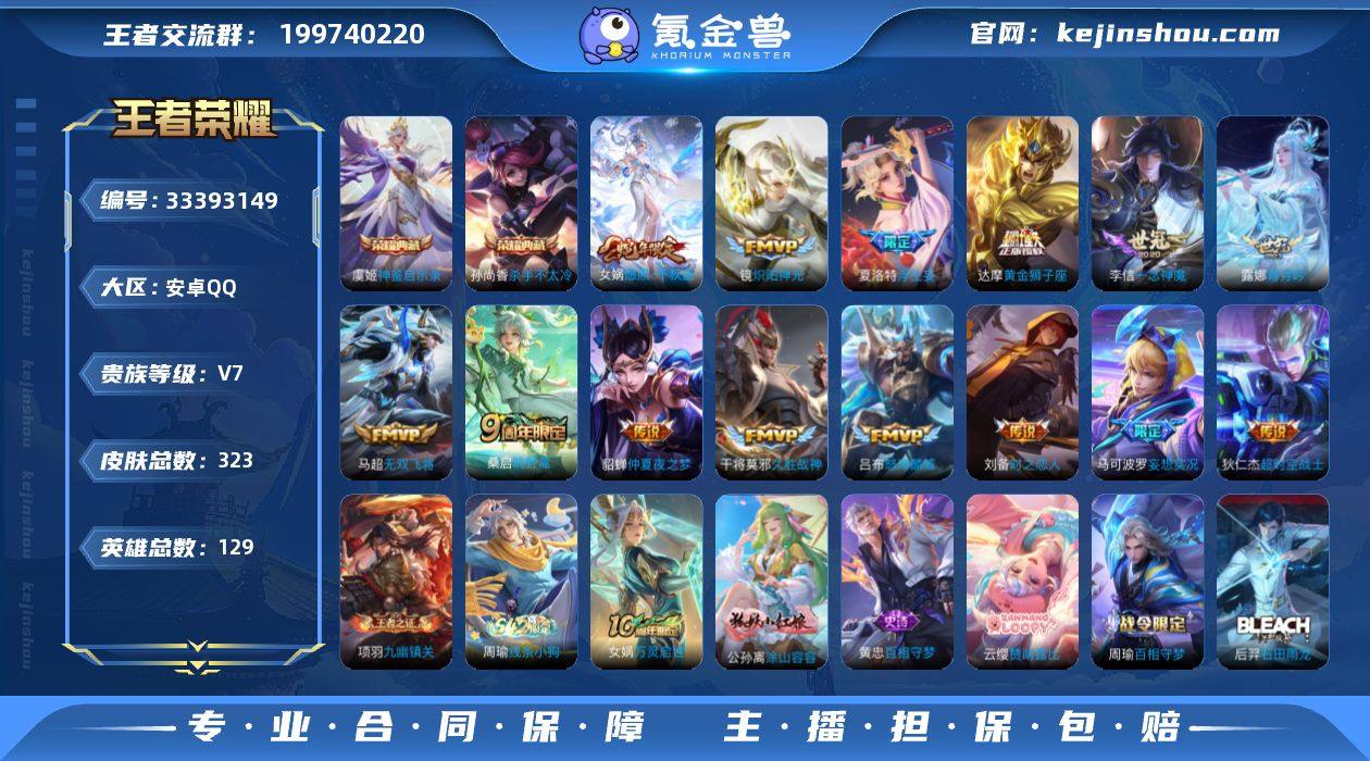 安卓Q-V7-永恒钻石III段位-129英雄-323皮肤-2典藏皮肤-14传说-80史诗 【英雄全皮】:孙权全皮,敖隐全皮,戈娅全皮,空空儿全皮,影全皮 【荣耀典藏】:孙尚香杀手不太冷,虞姬神鉴启示录 【传说皮肤】:女娲愿照千秋盛,桑启鸣野蒿,露娜霜月吟,马可波罗妄想实况,夏洛特浮生妄,吕布怒海麟威,马超无双飞将,镜炽阳神光,李信一念神魔,刘备时之恋人,干将莫邪久胜战神,达摩黄金狮子座,貂蝉仲夏夜之梦,狄仁杰超时空战士 【限定皮肤】:蔡文姬夏日便利店,虞姬夏日便利店,姜子牙天穹之誓,狄仁杰阴阳师,赵云皇家上将,孙尚香蔷薇恋人,庄周高山流水,扁鹊奇幻香踪,元歌无心,夏侯惇朔风刀,典韦蓝屏警告,马可波罗暗影游猎,马可波罗妄想实况,狄仁杰魔术师,狄仁杰万华元夜,达摩沙漠行僧,项羽海滩派对,老夫子醍醐杖,关羽百相守梦,程咬金演武夺筹,牛魔御旌,李元芳银河之约,李元芳云中旅人,钟馗驱傩正仪,杨戬潮玩骑兵,雅典娜单词大作战,雅典娜黎明之约,蔡文姬繁星吟游,鬼谷子原初探秘者,鬼谷子五谷丰年,苏烈千军破阵,百里玄策原初追逐者,弈星混沌棋,梦奇顽趣,沈梦溪大漠名商,明世隐疑决卦,裴擒虎李小龙,裴擒虎擒涛扼浪,米莱狄御霄,云中君纤云...