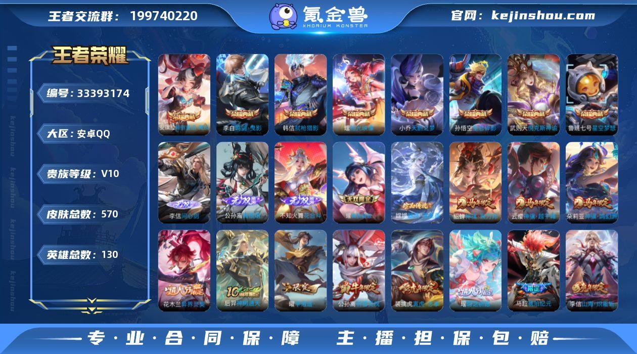 安卓Q-V10-至尊星耀IV段位-130英雄-570皮肤-8典藏皮肤-1典藏英雄-4无双-1珍品传说-95传说-197史诗 【英雄全皮】:姜子牙全皮,刘邦全皮,孙权全皮,艾琳全皮,大乔全皮,李信全皮,猪八戒全皮,上官婉儿全皮,敖隐全皮,蒙犽全皮,鲁班大师全皮,镜全皮,夏洛特全皮,戈娅全皮,空空儿全皮,影全皮,海诺全皮,少司缘全皮 【荣耀典藏】:武则天英雄,孙悟空全息碎影,武则天倪克斯神谕,小乔天鹅之梦,鲁班七号星空梦想,李白鸣剑曳影,韩信弑枪猎影,瑶拾光映像,安琪拉颠倒童话魔镜 【无双皮肤】:李信问心剑,公孙离离恨烟,不知火舞花合斗,瑶真我赫兹 【珍品传说】:嫦娥器灵落星盏 【传说皮肤】:云缨神骥越千峰,朵莉亚神骥鸣幻洲,貂蝉神骥聚万邦,花木兰异界灵契,后羿神树通天,桑启鸣野蒿,庄周牧神诗旅,夏侯惇霜北刀,铠冥王哈迪斯,朵莉亚心动手记,海月金乌负日,吕布曦玄引,貂蝉曦玄引,典韦战鼓燎原,孙策乘龙淬吴钩,马超琥珀纪元,铠琥珀纪元,澜逐花归海,艾琳觅芳踪,露娜霜月吟,孙膑小动物乐团,大乔时之奇旅,鲁班七号时之奇旅,兰陵王影龙天霄,吕布遇见神鼓,宫本武藏惊梅引,云缨鹤归松栖,上官婉儿妄想奇谈,马可波罗妄想实况,东皇太一灼幽烈阳...