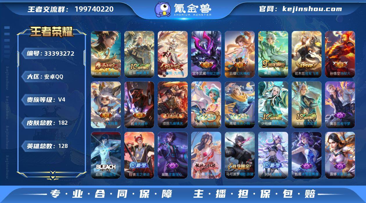 安卓Q-V4-最强王者段位-128英雄-182皮肤-10传说-48史诗 【英雄全皮】:敖隐全皮,空空儿全皮,影全皮 【传说皮肤】:狄仁杰神骥赴朔漠,后羿神树通天,澜愿照九州拓,云缨幻光神枪,桑启鸣野蒿,李元芳飞鸢探春,铠绛天战甲,花木兰冠军飞将,宫本武藏地狱之眼,孙悟空地狱火 【限定皮肤】:蒙犽顽岩魄,蔡文姬夏日便利店,大乔绒语心约,虞姬夏日便利店,姜子牙天穹之誓,狄仁杰阴阳师,赵云皇家上将,元歌无心,马可波罗暗影游猎,项羽海滩派对,百里玄策原初追逐者,裴擒虎李小龙,云中君纤云弄巧,嫦娥暖冬兔眠,鲁班大师探海日志,艾琳女武神,阿古朵江河有灵,张良古海寻踪,蒙犽百解令,鬼谷子天穹祈灯,沈梦溪龙舞盛年,刘邦剑破天穹,程咬金群星魔术团,周瑜熔金海岸 【年限皮肤】:澜愿照九州拓 【赛季限定】:鲁班大师探海日志,张良古海寻踪,鬼谷子天穹祈灯,刘邦剑破天穹,姜子牙天穹之誓,东皇太一噬灭天穹,太乙真人谧流熔炉,钟馗虚灵犬护,甄姬逆浪荇歌,亚瑟荣光之誓,百里玄策原初追逐者,牛魔星界战将,项羽九幽镇关 【战令限定】:马可波罗暗影游猎,嫦娥暖冬兔眠,蔡文姬夏日便利店,虞姬夏日便利店,孙膑茶境仙,马超访茗客,周瑜线条小狗,小乔线条...