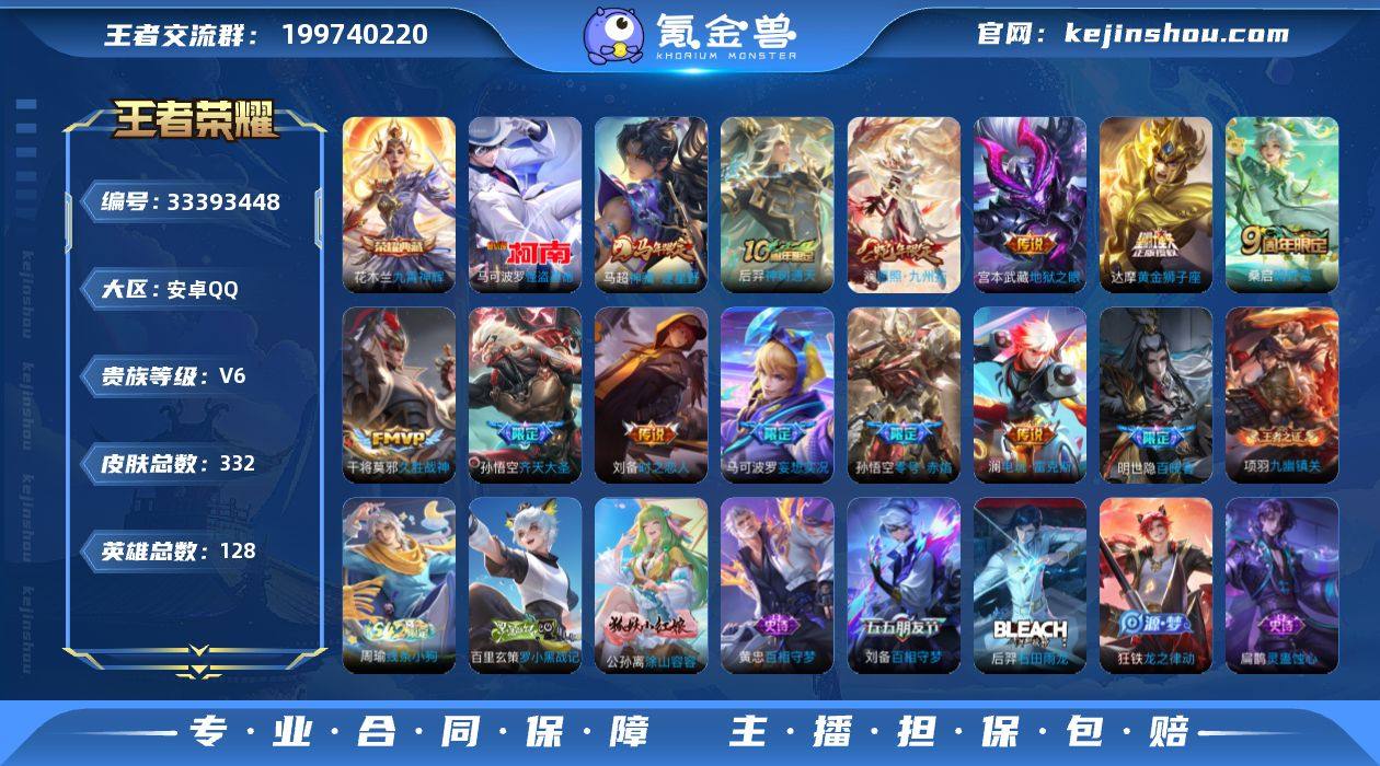 安卓Q-V6-最强王者段位-128英雄-332皮肤-1典藏皮肤-1珍品传说-12传说-104史诗 【英雄全皮】:刘禅全皮,孙权全皮,刘备全皮,戈娅全皮 【荣耀典藏】:花木兰九霄神辉 【珍品传说】:马可波罗怪盗基德 【传说皮肤】:马超神骥逐星野,后羿神树通天,澜愿照九州拓,桑启鸣野蒿,马可波罗妄想实况,澜电玩雷克斯,孙悟空齐天大圣,孙悟空零号赤焰,刘备时之恋人,干将莫邪久胜战神,达摩黄金狮子座,宫本武藏地狱之眼 【限定皮肤】:蒙犽顽岩魄,蔡文姬夏日便利店,虞姬夏日便利店,姜子牙天穹之誓,杨戬破阵退雄兵,李白谪仙醉月,狄仁杰阴阳师,赵云皇家上将,孙尚香蔷薇恋人,庄周高山流水,高渐离死亡摇滚,阿轲迷踪丽影,扁鹊奇幻香踪,芈月幻夜卜梦,元歌云间偶戏,元歌无心,马可波罗暗影游猎,马可波罗妄想实况,狄仁杰魔术师,狄仁杰万华元夜,达摩沙漠行僧,项羽海滩派对,老夫子醍醐杖,程咬金演武夺筹,韩信逐梦之影,王昭君午后时光,兰陵王金庭之子,花木兰默契交锋,亚瑟潮玩骑士王,孙悟空至尊宝,孙悟空零号赤焰,孙悟空孙行者,孙悟空齐天大圣,后羿圣弓游侠,刘备百相守梦,李元芳银河之约,李元芳云中旅人,钟馗驱傩正仪,杨戬潮玩骑兵,干将莫邪真爱魔法,...