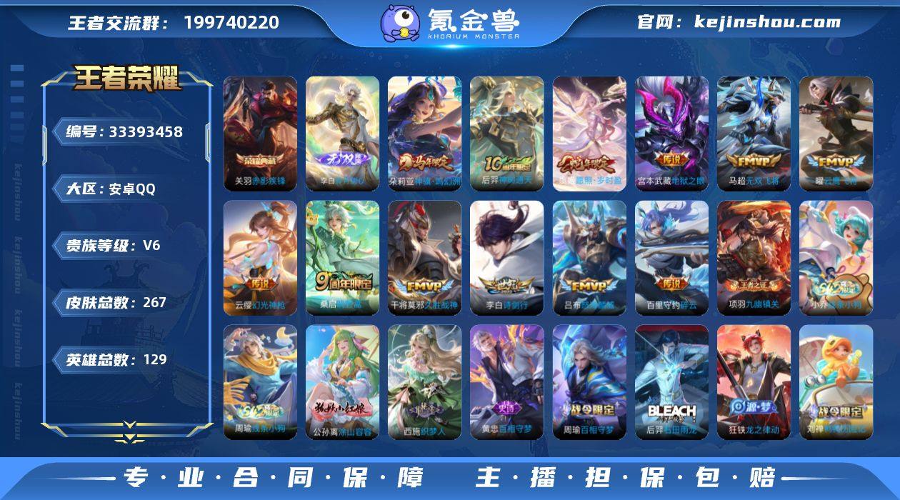 安卓Q-V6-永恒钻石IV段位-129英雄-267皮肤-1典藏皮肤-1无双-12传说-85史诗 【英雄全皮】:猪八戒全皮,敖隐全皮 【荣耀典藏】:关羽赤影疾锋 【无双皮肤】:李白碎月剑心 【传说皮肤】:朵莉亚神骥鸣幻洲,后羿神树通天,虞姬愿照岁时盈,云缨幻光神枪,桑启鸣野蒿,吕布怒海麟威,李白诗剑行,百里守约碎云,马超无双飞将,曜云鹰飞将,干将莫邪久胜战神,宫本武藏地狱之眼 【限定皮肤】:暃埋骨钱,姜子牙天穹之誓,狄仁杰阴阳师,赵云皇家上将,嬴政优雅恋人,鲁班七号狮舞东方,庄周高山流水,高渐离玩趣恶龙,扁鹊奇幻香踪,吕布御风骁将,元歌云间偶戏,夏侯惇朔风刀,甄姬游园惊梦,典韦蓝屏警告,马可波罗暗影游猎,狄仁杰魔术师,狄仁杰万华元夜,达摩星际陆战队,达摩沙漠行僧,项羽海滩派对,老夫子醍醐杖,关羽冰锋战神,关羽百相守梦,程咬金演武夺筹,兰陵王金庭之子,亚瑟潮玩骑士王,孙悟空大圣娶亲,孙悟空孙行者,牛魔御旌,李元芳银河之约,李元芳云中旅人,钟馗神迹守卫,钟馗驱傩正仪,杨戬潮玩骑兵,女娲朔望之晖,雅典娜单词大作战,雅典娜黎明之约,蔡文姬繁星吟游,太乙真人华丽摇滚,鬼谷子原初探秘者,鬼谷子五谷丰年,苏烈千军破阵,百里玄策原初...