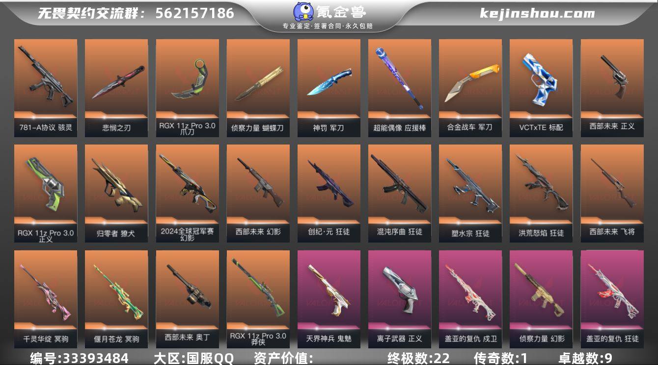 【PTWW3900】LV等级267/皮肤总价值50060/段位神话/总皮肤数量81/刀皮数量7/枪皮数量74/套装数量3/具体详情请看图/无畏契约季前邀请赛套装/西部未来/RGX 11z Pro//3.0套装/幻棱/炼狱/维斯/暮蝶/钛狐/壹决/铁臂/捷风/雷兹/幽影/不死鸟/贤者/猎枭/蝰蛇/零/芮娜/奇乐/尚勃勒/霓虹/斯凯/夜露/星礈/K/O/海神/盖可/黑梦/钢锁/无畏契约季前邀请赛 悲悯之刃/蝴蝶刀-侦察力量/爪刀-RGX 11z Pro 3.0/未来开拓者/超能偶像 应援棒/军刀-合金战车/军刀-神罚/狂徒-洪荒怒焰/狂徒-混沌序曲/狂徒-塑水宗/狂徒-创·纪元/狂徒-盖亚的复仇/狂徒-紫阙金琅/狂徒-超能偶像/幻影-2024全球冠军赛/幻影-西部未来/幻影-侦察力量/幻影-合金战车/幻影-神圣领域/幻影-聚合之力/戍卫-盖亚的复仇/戍卫-超能偶像/戍卫-花漾粉红/戍卫-月球哨兵/獠犬-归零者/獠犬-神圣领域/獠犬-采蜜小蜂队/獠犬-数码咒术/冥驹-千灵华绽/冥驹-偃月苍龙/冥驹-堕天遗武/冥驹-掠影/冥驹-花漾粉红/冥驹-星云暗涌/飞将-西部未来/飞将-合金战车/飞将-聚合之力/莽侠-RGX 11z Pro 3.0/莽侠-月球哨兵/战神-神圣领域/战神-采蜜小蜂队/战神-浮光跃金/战神-数码咒术/奥丁-西部未来/奥丁-紫阙金琅2.0/判官-超能偶像/判官-采蜜小蜂队/判官-数码咒...