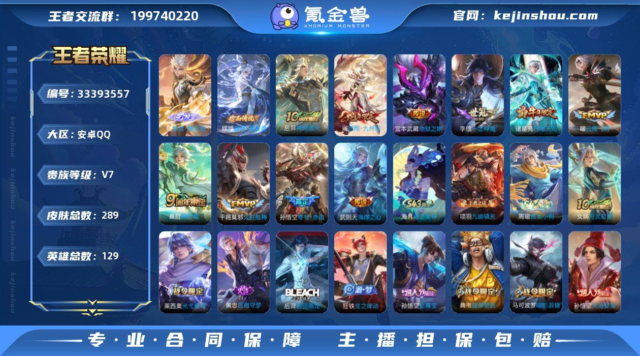 安卓Q-V7-至尊星耀II段位-129英雄-289皮肤-1典藏英雄-1无双-1珍品传说-10传说-69史诗 【英雄全皮】:猪八戒全皮 【荣耀典藏】:武则天英雄 【无双皮肤】:曜器灵螭龙剑 【珍品传说】:嫦娥器灵落星盏 【传说皮肤】:后羿神树通天,澜愿照九州拓,桑启鸣野蒿,诸葛亮时雨天司,孙悟空零号赤焰,曜云鹰飞将,李信一念神魔,干将莫邪久胜战神,宫本武藏地狱之眼,武则天海洋之心 【限定皮肤】:白起狰,狄仁杰阴阳师,虞姬凯尔特女王,赵云皇家上将,墨子神迹守卫,嬴政白昼王子,孙尚香蔷薇恋人,庄周高山流水,高渐离死亡摇滚,高渐离玩趣恶龙,芈月重明,芈月幻夜卜梦,吕布猎兽之王,元歌云间偶戏,元歌无心,夏侯惇朔风刀,曹操烛龙,典韦穷奇,典韦蓝屏警告,马可波罗暗影游猎,狄仁杰魔术师,狄仁杰万华元夜,达摩沙漠行僧,项羽海滩派对,老夫子醍醐杖,老夫子航海奇遇记,程咬金演武夺筹,韩信飞衡,兰陵王金庭之子,亚瑟潮玩骑士王,孙悟空至尊宝,孙悟空大圣娶亲,孙悟空零号赤焰,牛魔御旌,后羿圣弓游侠,李元芳云中旅人,钟馗驱傩正仪,杨玉环遇见飞天,女娲朔望之晖,干将莫邪真爱魔法,雅典娜黎明之约,太乙真人饕餮,鬼谷子原初探秘者,鬼谷子五谷丰年,诸葛亮...