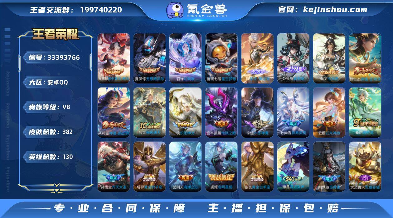 安卓Q-V8-永恒钻石I段位-130英雄-382皮肤-4典藏皮肤-1典藏英雄-2无双-1珍品传说-14传说-99史诗 【英雄全皮】:刘禅全皮,刘邦全皮,孙权全皮,猪八戒全皮,敖隐全皮,戈娅全皮,空空儿全皮 【荣耀典藏】:武则天英雄,夏侯惇无限飓风号,鲁班七号星空梦想,貂蝉幻阙歌,安琪拉颠倒童话魔镜 【无双皮肤】:曜器灵螭龙剑,公孙离离恨烟 【珍品传说】:伽罗沧流箭 【传说皮肤】:朵莉亚神骥鸣幻洲,狄仁杰神骥赴朔漠,后羿神树通天,云缨幻光神枪,桑启鸣野蒿,孙悟空齐天大圣,孙尚香异界灵契,镜炽阳神光,虞姬启明星使,李信一念神魔,张良黄金白羊座,后羿黄金射手座,宫本武藏地狱之眼,武则天海洋之心 【限定皮肤】:白起狰,公孙离离恨烟,蔡文姬夏日便利店,大乔绒语心约,虞姬夏日便利店,姜子牙天穹之誓,狄仁杰阴阳师,赵云皇家上将,墨子神迹守卫,嬴政优雅恋人,孙尚香蔷薇恋人,孙尚香异界灵契,庄周高山流水,阿轲迷踪丽影,钟无艳王者之锤,钟无艳超时空战士,扁鹊奇幻香踪,白起夜都怪侠,芈月幻夜卜梦,元歌云间偶戏,元歌无心,夏侯惇朔风刀,甄姬游园惊梦,甄姬落雪兰心,典韦穷奇,马可波罗暗影游猎,狄仁杰魔术师,狄仁杰万华元夜,达摩沙漠行僧,项羽海滩...