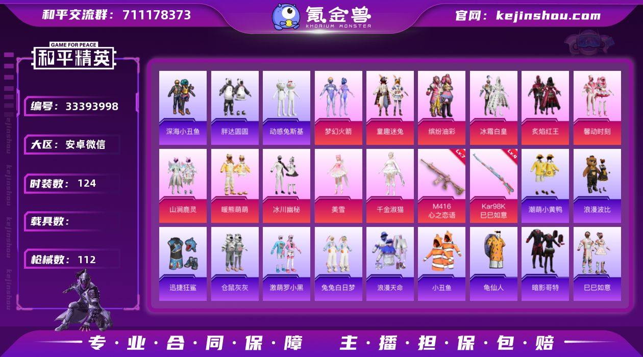 安卓 微信-11粉装-2特效枪-0载具-1粉色飞行器-44959热力值-10王牌印记-124套装-112枪皮【热门品类】:粉装-梦幻火箭,粉装-童趣迷兔,粉装-缤纷油彩,套装-浪漫天命,套装-深海小丑鱼,套装-小丑鱼,套装-胖达圆圆,套装-动感兔斯基人偶服,套装-龟仙人,套装-潮萌小黄鸭,套装-暗影哥特,套装-浪漫波比【粉色套装】:粉装-梦幻火箭,粉装-缤纷油彩,粉装-冰霜白皇,粉装-童趣迷兔,粉装-炙焰红王,粉装-馨动时刻,粉装-山涧鹿灵,粉装-暖熊萌萌,粉装-冰川幽秘,角色-美雪,角色-千金淑猫【粉色枪皮等级】:M416-心之恋语(七级),Kar98K-巳巳如意(四级)【粉色枪皮】:M416-心之恋语,Kar98K-巳巳如意【粉色飞行器】:天之羽翼飞行器【粉色降落伞】:梦幻火箭降落伞,荧光虫舞降落伞,童趣迷兔降落伞,焦糖拿铁降落伞,碧影闪光降落伞,炙焰牛王降落伞,暖熊萌萌降落伞,第五大道降落伞,千金淑猫降落伞,樱桃泡泡降落伞【稀有套装】:套装-龟仙人,套装-巳巳如意,角色-都市丽猫,角色-摩登魅猫,套装-燕燕于飞,套装-鱼渊荷华,角色-糖霜甜心【稀有枪皮】:AKM-彩虹符号,AKM-恐龙拽拽,AKM-灼热熔岩,AKM-虎虎生威,AKM-霓虹街区,AKM-龙的传人,M16A4-幻世战舞者,M16A4-...