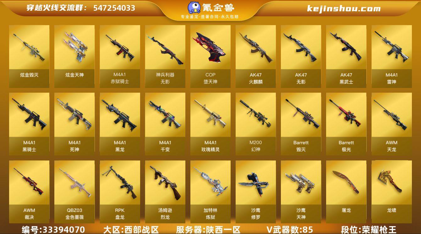 陕西一区-88V-8王者-3炫金【冠军之幻+幻神音效卡丹凤黄忠❤6音效生化6盘6烈龙蝴蝶枪❤冠军之薇之刃冠军之特心魄怒❤竞技荣光套鲨臂】 【热门武器】:QBZ03-金色蔷薇,M200-幻神,M200-竞技荣光,柯尔特-冠军之特,M4A1-黑骑士,汤姆逊-烈龙*6,RPK-盘龙*5,加特林-炼狱*2,斯泰尔-蝴蝶,裁决-雪莉杨,COP-堕天神,沙鹰-修罗,Knife-冠军之刃*2,黄金猫猫手套-白鲨 【王者炫金武器】:炫金天神*2,炫金毁灭 【音效卡】:M200-幻神音效卡,AK47-火麒麟音效卡,M4A1-雷神音效卡,M4A1-黑骑士音效卡,Barrett-毁灭音效卡,QBZ03-金色蔷薇音效卡 【稀有皮肤】:M200-幻神-黄忠皮肤,幻神-冠军之幻,幻神-丹凤,QBZ03-冠军之薇,雷神-能量核心,雷神-荣耀之魄,雷神-冠军之魄,雷神-R.LGD-CFPLS18冠军,火麒麟-冠军之心*2,火麒麟-心动糖果,黑骑士-冠军之势,黑龙-冠军之武,毁灭-荣耀之怒,毁灭耀金皮肤,毁灭-冠军之怒,毁灭-战神张飞,毁灭-黑大圣皮肤,天龙-能量核心,修罗-冠军之魂*2 【角色】:王者-瞳-闭月羞花,王者樱-热浪之夏,王者-零-国色天香,零-水下丽影,葵,电竞教官-云悠悠,战地猎狐,铁骑荣耀,职业选手 【人偶武器】:裁决-雪莉杨,斯泰尔-蝴蝶,雷神-枪娘蕾...