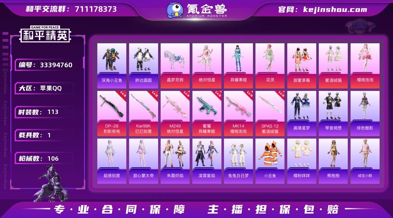 苹果 手Q-8粉装-9特效枪-1载具-4粉色飞行器-38018热力值-6王牌印记-113套装-106枪皮 【热门品类】:套装-深海小丑鱼,套装-小丑鱼,套装-胖达圆圆,套装-糯粉咩咩 【粉色套装】:角色-绝对恒星,粉装-甜蜜草莓,粉装-蜜语绒猫,角色-樱桃泡泡,角色-花灵,角色-异瞳寒姬,人物-小舞·灵珑,人物-小舞·恋语 【粉色枪皮等级】:蜜獾-异瞳寒姬(四级),UMP45-萌骑冒险(四级),AKS-74U-森灵之息(五级),Kar98K-巳巳如意(五级),Mk14-樱桃泡泡(四级),Mk14-福马献瑞(五级),SPAS-12-蜜语绒猫(四级),M249-绝对恒星(四级),DP-28-豹影疾电(五级) 【粉色载具】:晶梦灵驹 【粉色枪皮】:蜜獾-异瞳寒姬,UMP45-萌骑冒险,AKS-74U-森灵之息,Kar98K-巳巳如意,Mk14-樱桃泡泡,Mk14-福马献瑞,SPAS-12-蜜语绒猫,M249-绝对恒星,DP-28-豹影疾电 【粉色飞行器】:绝对恒星飞行器,香车宝马飞行器,炫彩糖果飞行器,极意拳锋飞行器 【粉色降落伞】:绝对恒星降落伞,甜蜜草莓降落伞,蜜语绒猫降落伞,樱桃泡泡降落伞,绯穹魔姬降落伞,异瞳寒姬降落伞,炫彩糖果降落伞,幻骨萌王降落伞,鸢尾珑雾降落伞 【稀有套装】:套装-熊抱抱,套装-绒宝小鹅,套装-巳巳如意,角色-超感刻度,角色-甜心...