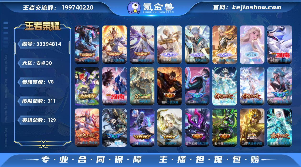 实名: 可修改 贵族等级: V8 英雄数: 129 皮肤数: 311 荣耀水晶: 九霄神辉,神鉴启示录,千魇归渊 无双皮: 雪境奇遇-甄姬,器灵·螭龙剑,天机白泽,无相 珍品传说: 江户川柯南,怪盗基德,时之奇旅-孙策 传说皮: 黄金狮子座,黄金射手座,黄金白羊座,久胜战神,炽阳神光,末日机甲-孙尚香,地狱之眼,时之恋人-刘备,淬星耀世,澜逐花归海,琥珀纪元铠,乘龙·淬吴钩,落雪白狼,铠冥王哈迪斯,幻光神枪,九山相柳,万灵伏威,神树通天 限定皮: 李小龙,游园惊梦,时雨天司,神威,乒乒小将,逐梦之影,至尊宝,高山流水,孙行者,玉兔公主,五谷丰年,山海·玄木吟,夏侯惇霜北刀,鸣野蒿,逐霄战戟,愿照·千秋盛,愿照·众生和