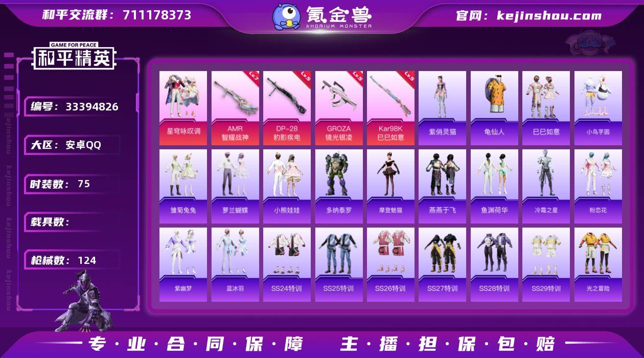 安卓 手Q-1粉装-5特效枪-0载具-1粉色飞行器-31439热力值-4王牌印记-75套装-124枪皮 【热门品类】:套装-龟仙人 【粉色套装】:粉装-星穹咏叹调 【粉色枪皮等级】:GROZA-镜光银凌(五级),Kar98K-巳巳如意(五级),Mk14-福马献瑞(一级),AMR-智耀战神(七级),DP-28-豹影疾电(五级) 【粉色枪皮】:GROZA-镜光银凌,Kar98K-巳巳如意,Mk14-福马献瑞,AMR-智耀战神,DP-28-豹影疾电 【粉色飞行器】:炫彩糖果飞行器 【粉色降落伞】:精灵梦叶罗丽降落伞,创世·救赎降落伞,初号机 觉醒Ver.降落伞,忍者神龟降落伞,鬼刀降落伞,喜羊羊与灰太狼降落伞,炫彩糖果降落伞 【稀有套装】:套装-龟仙人,套装-巳巳如意,套装-小鸟芋圆,套装-炫彩糖果,套装-马上有钱,套装-雏菊兔兔,套装-萝兰蝴蝶,套装-小熊娃娃,角色-多纳泰罗,角色-摩登魅猫,套装-燕燕于飞,套装-鱼渊荷华,角色-冷霜之星,套装-粉恋花,套装-紫幽梦,套装-蓝冰羽,角色-紫俏灵猫 【稀有枪皮】:AKM-破晓战魂,AKM-缤纷海域,AKM-霓虹街区,M16A4-幻世战舞者,M16A4-红色方程式,M16A4-蓝色火焰,M16A4-千金淑猫,SCAR-L-红色方程式,M416-糯团青竹,M416-红色方程式,M416-蓝色火焰,AUG-天降萌叽,AUG-耀粉歌者,...
