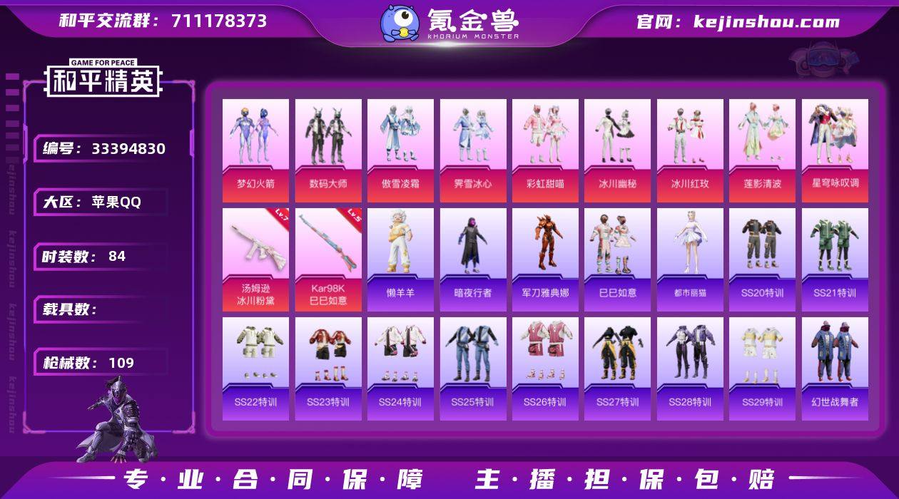 苹果 手Q-9粉装-2特效枪-0载具-3粉色飞行器-39177热力值-7王牌印记-84套装-109枪皮 【热门品类】:粉装-梦幻火箭,角色-军刀雅典娜,套装-暗夜行者 【粉色套装】:粉装-数码大师,粉装-梦幻火箭,粉装-傲雪凌霜,粉装-霁雪冰心,粉装-彩虹甜喵,粉装-冰川幽秘,粉装-冰川红玫,粉装-莲影清波,粉装-星穹咏叹调 【粉色枪皮等级】:汤姆逊-冰川粉黛(七级),Kar98K-巳巳如意(五级) 【粉色枪皮】:汤姆逊-冰川粉黛,Kar98K-巳巳如意 【粉色飞行器】:闪光银龙飞行器,太空嘟嘟飞行器,极意拳锋飞行器 【粉色降落伞】:百万伏特降落伞,洛神天依降落伞,炙焰牛王降落伞,垂柳戏鸭降落伞,翩跹演武降落伞,千面幻镜降落伞,旋转彩虹降落伞,冰川粉黛降落伞,桃夭倾城降落伞,海螺星光降落伞,莲影清波降落伞,蜜语绒猫降落伞 【稀有套装】:套装-巳巳如意,角色-都市丽猫,玩偶服-懒羊羊 【稀有枪皮】:AKM-2P战斗服款,AKM-墨染幽兰,AKM-破晓战魂,AKM-龙的传人,M16A4-幻世战舞者,M16A4-甜心亚梦,SCAR-L-炫彩节奏,SCAR-L-玉兔迎春,SCAR-L-红色方程式,M416-暗夜行者,M416-糯团青竹,M416-红色方程式,M416-蓝色火焰,GROZA-田园牧歌,AUG-耀粉歌者,QBZ-彩虹符号,M762-奇异...
