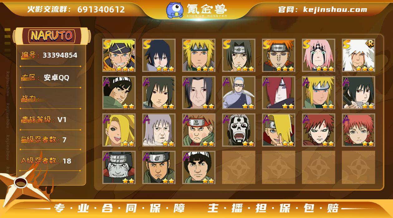【HYX3752】VIP等级V1/S忍数量7/A忍数量18/二星A-我爱罗「疾风传」/二星A-飞段「死司凭血」/三星S-宇智波佐助「永恒万花筒」/二星A-长门「青年」/二星A-迈特凯/2星小南「神驹佑将」/二星A-蝎/三星S-佩恩「天道」/三星S-漩涡鸣人·宇智波佐助/三星S-波风水门/二星A-秋道丁次「忍界大战」/二星A-长十郎「六代目水影」/二星A-波风水门 「青年」/三星S-自来也「舞之豪杰」/二星A-迪达拉「秽土转生」/二星A-猿飞阿斯玛/三星S-春野樱 「忍界大战」/二星A-宇智波鼬 「夏日限定」/二星A-宇智波泉奈/二星A-迪达拉/二星A-干柿鬼鲛/二星A-迈特凯「青春爆炸」/二星A-宇智波佐助「须佐能乎」/二星A-千代「近松十人卫」/三星S-宇智波鼬 「须佐能乎」