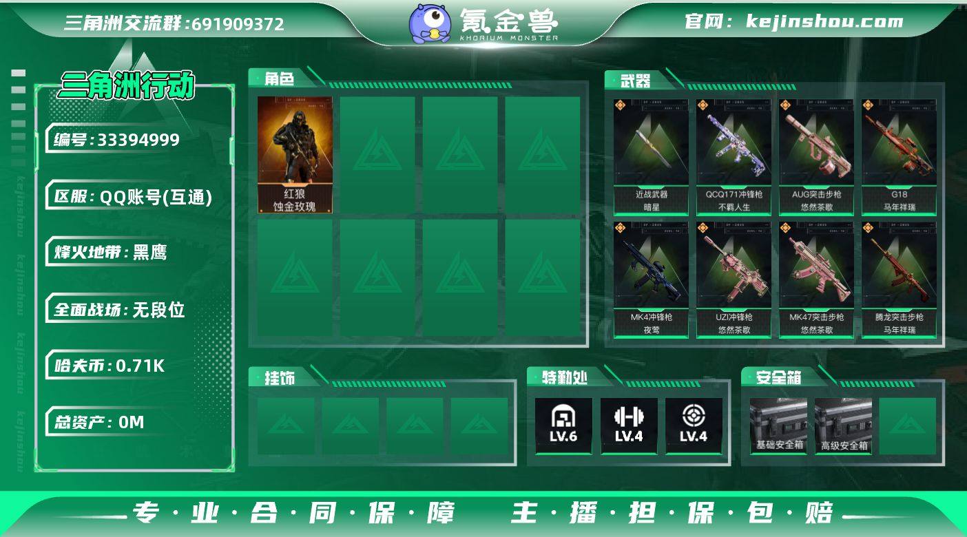 实名: 不可修改 烽火地带段位: 黑鹰 全面战场段位: 无段位 总资产: 12 哈夫币: 711 干员外观: 红狼-蚀金玫瑰 传说武器皮肤: M4A1突击步枪-蚀金玫瑰,SG552突击步枪-运动员,近战-暗星,MK47突击步枪-暗星,SR-3M紧凑突击步枪-暗星,M14射手步枪-蛮荒,K416突击步枪-行动记录,腾龙突击步枪-马年祥瑞,G18-马年祥瑞,MK4冲锋枪-夜莺,勇士冲锋枪-万金泪冠,腾龙突击步枪-万金泪冠,AWM狙击步枪-万金泪冠,.357左轮-缄花,SR-25射手步枪-缄花,M14射手步枪-缄花,MK47突击步枪-悠然茶歇,AUG突击步枪-悠然茶歇,UZI冲锋枪-悠然茶歇,QCQ171冲锋枪-不羁人生