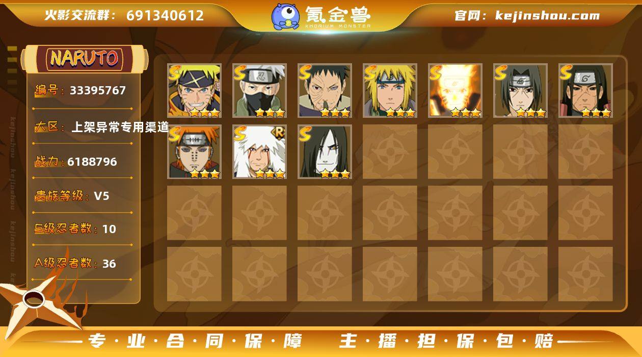 能二次修改实名认证,号非常安全,有忍战带土秽土柱间黄猿须佐卡卡西神驹小南须佐佐助卑留呼青水青年艾仙人巳月等很多火影热门强势忍者,九喇嘛水门76碎片,传说自来也65碎片,豪华版忍法帖已买,号里还有213张高招卷,具体情况看图,火爆区人多热闹,标价低要的直接下单,全天在线