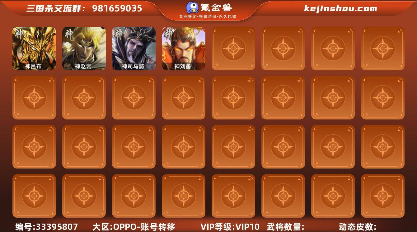 VIP等级:VIP10 卖家说:神司马懿,谋关羽,曹髦,司马昭,张奋,南华老仙,鲍信,留赞,动大宝,动星黄忠,还有一些比较好用的武将自己看吧,很多动皮,看上的直接买就行,转移号,安全放心后续充值不会被找回,只需下载个oppo游戏中心即可游玩