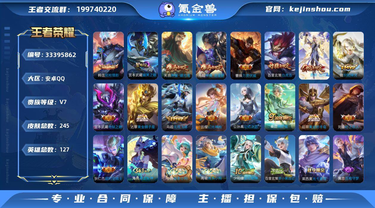 实名: 可修改 贵族等级: V7 英雄数: 127 皮肤数: 245 荣耀水晶: 弑枪猎影 星传说: 幽冥之眼 传说皮: 黄金狮子座,黄金射手座,炽阳神光,地狱之眼,时之恋人-刘备,超时空战士-狄仁杰,无双飞将,记忆之芯,幻光神枪,万灵伏威,神骥·逐星野,神骥·镇沧海 限定皮: 李小龙,白虎志,百木心枪,五谷丰年,鸣野蒿,逐霄战戟,愿照·山河定