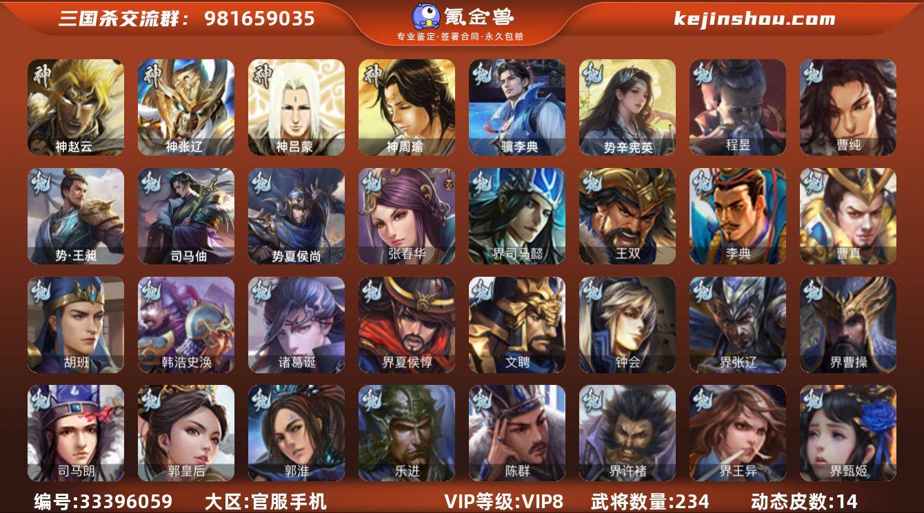 - 官阶:三等骠骑将军 - 等级:165级,V8 - 势·辛宪英(T0强将,排位军八通用) - 界徐盛(大宝,斗地主阴间武将) - 星黄忠、友徐庶、沙摩柯、谋关羽、关索、陆郁生等15+史诗将 - 全模式能打,排位/斗地主/军争随便玩 - 传说动态皮:辛宪英凤鸾鸾回、大宝破军杀将、陆郁生素心傲雪、周处义除三害等 - 多史诗皮、节日限定皮,颜值拉满 - 月卡剩余:211天,长期领元宝 - 金票:13万+ - 雁翎:2万+ - 将魂:1581 -碎灵:25 - 点将卡、手气卡、换将卡几百张,到手即玩