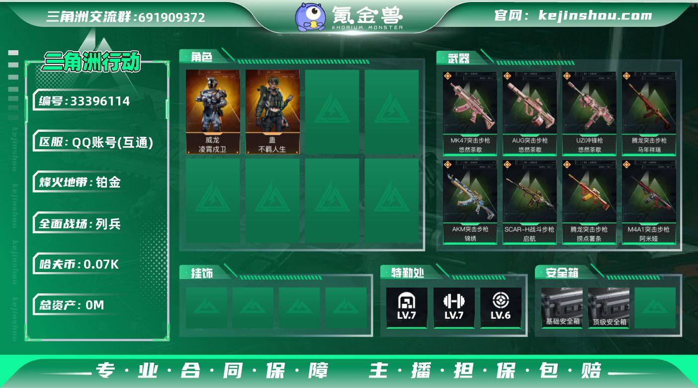 实名: 可修改 烽火地带段位: 铂金 全面战场段位: 列兵 总资产: 221 哈夫币: 71 干员外观: 威龙-凌霄戍卫,蛊-不羁人生 传说武器皮肤: M4A1突击步枪-阿米娅,腾龙突击步枪-捞点薯条,SCAR-H战斗步枪-启航,腾龙突击步枪-马年祥瑞,AKM突击步枪-锦绣,MK47突击步枪-悠然茶歇,AUG突击步枪-悠然茶歇,UZI冲锋枪-悠然茶歇